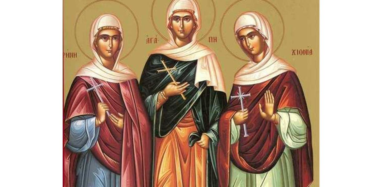 Sfintele Muceniţe fecioare Agapia, Irina şi Hionia au fost surori şi au locuit în apropierea cetăţii Aquileia. La acea vreme, împăratul Diocleţian, prigonitorul creştinilor, a venit în această cetate şi a poruncit uciderea părintelui Hrisogon. După aceasta, Dumnezeu i-a descoperit în vis lui Zoii, un preot în vârstă, locul în care se afla trupul neînsufleţit al lui Hrisogon. În urma acestei descoperiri, bătrânul a luat trupul părintelui martir şi l-a înmormântat după rânduială. După o lună, Sfântul Hrisogon i s-a arătat în vis lui Zoii, descoperindu-i că, peste nouă zile, cele trei surori fecioare vor primi moarte de martir şi că, odată cu ele, va muri şi el.