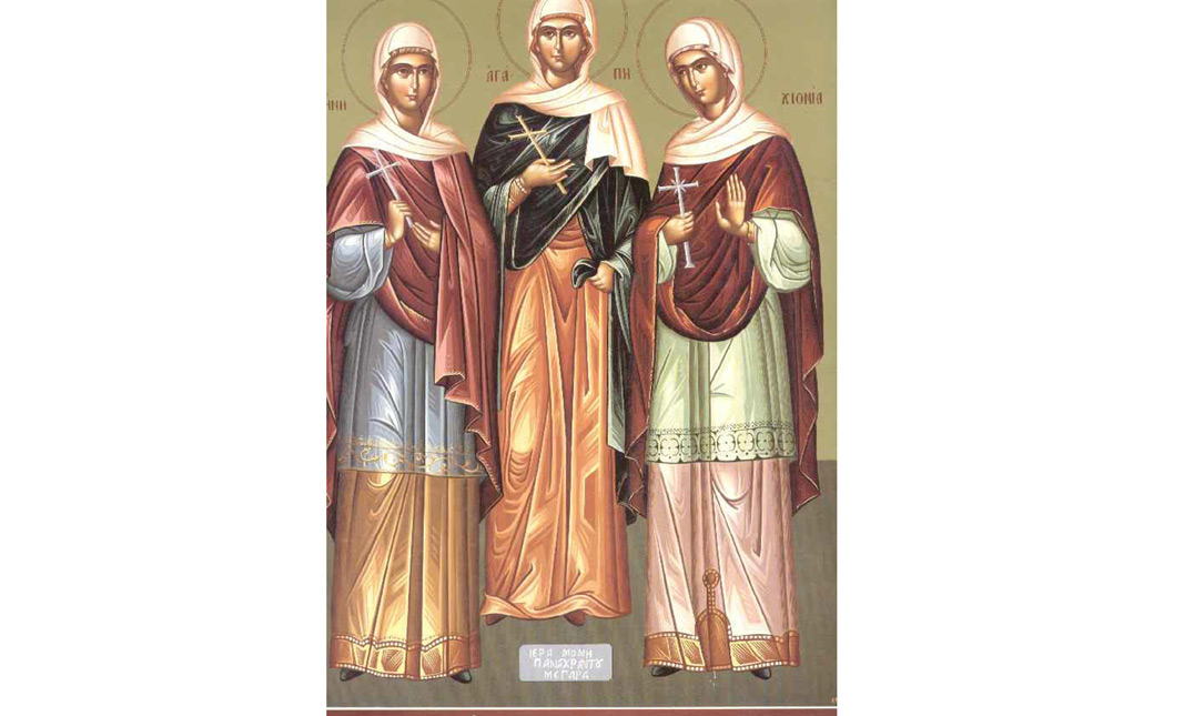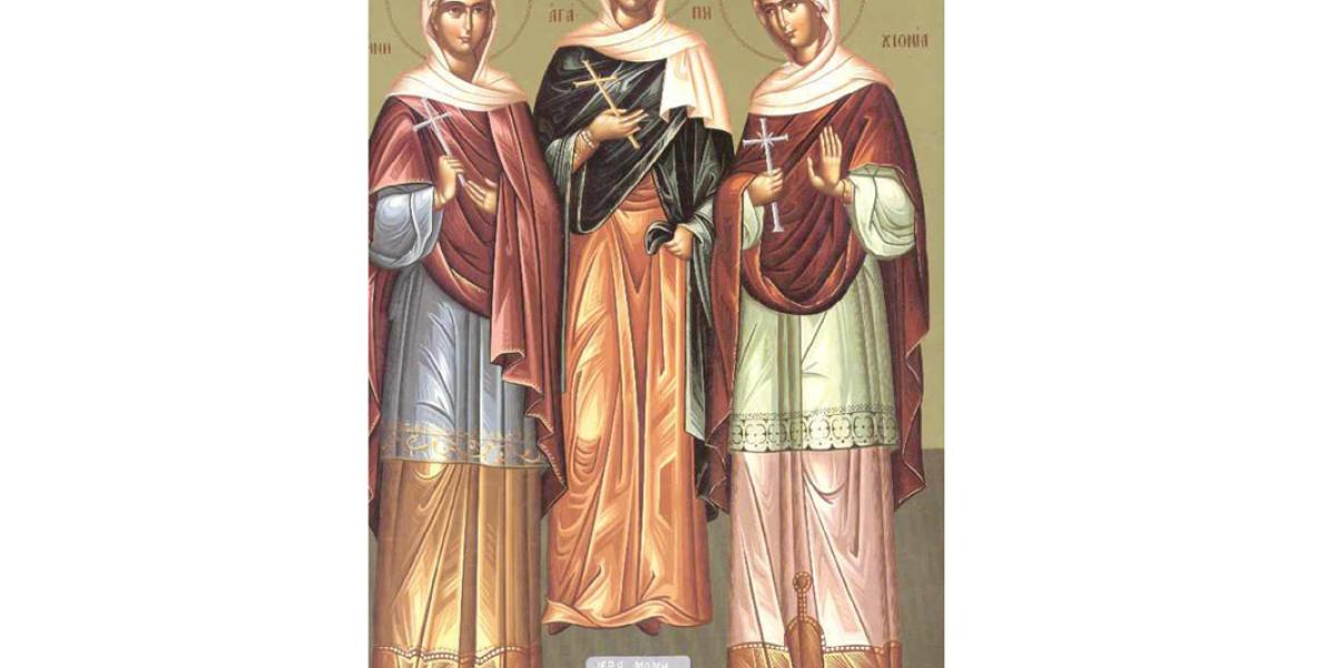 Astăzi sunt prăznuite Sfintele Muceniţe fecioare Agapia, Irina şi Hionia. Ele au fost surori si au locuit în apropierea cetăţii Aquileia. La acea vreme, împăratul Diocleţian, prigonitorul creştinilor, a venit în această cetate şi a poruncit uciderea părintelui Hrisogon. Dumnezeu i-a descoperit în vis lui Zoii, un preot în vârstă, locul în care se afla trupul neînsufleţit al lui Hrisogon. În urma acestei descoperiri, bătrânul a luat trupul părintelui şi l-a înmormântat după rânduială. După o lună, Sfântul Hrisogon i s-a arătat în vis lui Zoii, descoperindu-i că, peste nouă zile, cele trei surori fecioare vor primi moarte de martir şi că, odată cu ele, va muri şi el.