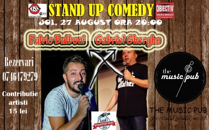 Actorii Gabriel Gherghe şi Fulvio Balboni vin la Brăila pentru a susţine un spectacol plin de umor la terasa The Music Pub. Show-ul stand up comedy al acestora va avea loc joi seară, de la ora 20:00, iar preţul unui bilet este de 15 lei. Gabriel este câştigătorul Stand Up Fest 2014 şi face parte din noua generaţie a comediei. Este moldovean, vine din Iaşi şi face stand-up comedy din luna mai 2012. A avut deja spectacole în cele mai cunoscute cluburi de comedie din toată ţară, a urcat pe scena Deko Cafe şi Club 99 şi a performat alături de comedianţi consacraţi ca Dan Badea, Teo, Vio, Costel şi Bordea. A mai avut spectacole şi în cadrul Stand-Up in The City, cel mai cunoscut turneu de profil din România cât şi la Festivalul Internaţional de Stand Up Comedy Cluj. În ceea ce-l priveşte pe Fulvio Balboni, acesta este un italian energic, a câştigat marele premiu în producţia tv "Banc - show" de la Prima Tv. Este comediant în serialul "Trăsniţii" şi, după cum ţin să sublinieze organizatorii, "ne face să zâmbim de fiecare dată când începe să vorbească, ajutat de accentul lui italian, care, de multe ori devine «accentuat»".