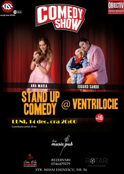 Amatorii de Stand Up Comedy şi ventrilocie din Brăila vor avea parte de o surpriză la începutul săptămânii viitoare. Este vorba despre două spectacole programate luni, începând cu ora 20:00, ale actriţei Ana-Maria Caliţa şi ventrilocului Eduard Sandu în The Music Pub din Brăila. Ana-Maria este absolventă a Universităţii de Artă Teatrală şi Cinematografică "I.L. Caragiale", Bucureşti, Facultatea de Teatru, Specializare Arta Actorului - Păpuşi şi Marionete, având masterat înTeatru de Animaţie. Aceasta susţine cursuri de teatru pentru copii şi adolescenţi, ateliere de teatru, spectacole în Bucureşti şi nu numai. Este membru fondator al Companiei de teatru şi evenimente "AnimArts" şi susţine că îi place foarte mult să descopere lumea prin oamenii pe care îi cunoaşte. La rândul său, ventrilocul Eduard Sandu este cunoscut prin prisma emisiunii "Românii au talent", unde a ocupat locul al treilea. Acesta oferă un spectacol inedit, cu un altfel de umor, îşi vrăjeşte publicul să creadă că păpuşile sunt fiinţe vii, după care îl binedispune prin atitudinea şi personalitatea personajelor create. Eduard este un artist complet şi complex, care uimeşte prin tehnica sa extraordinară, prin umor şi spontaneitate. Preţul unui bilet la cele două spectacole este de 20 lei. Trebuie reţinut însă că show-urile nu sunt recomandate celor care încă nu au împlinit vârsta de 16 ani. Brăilenii interesaţi de evenimentul din 14 decembrie pot face rezervări la numărul de telefon: 0746479279.
