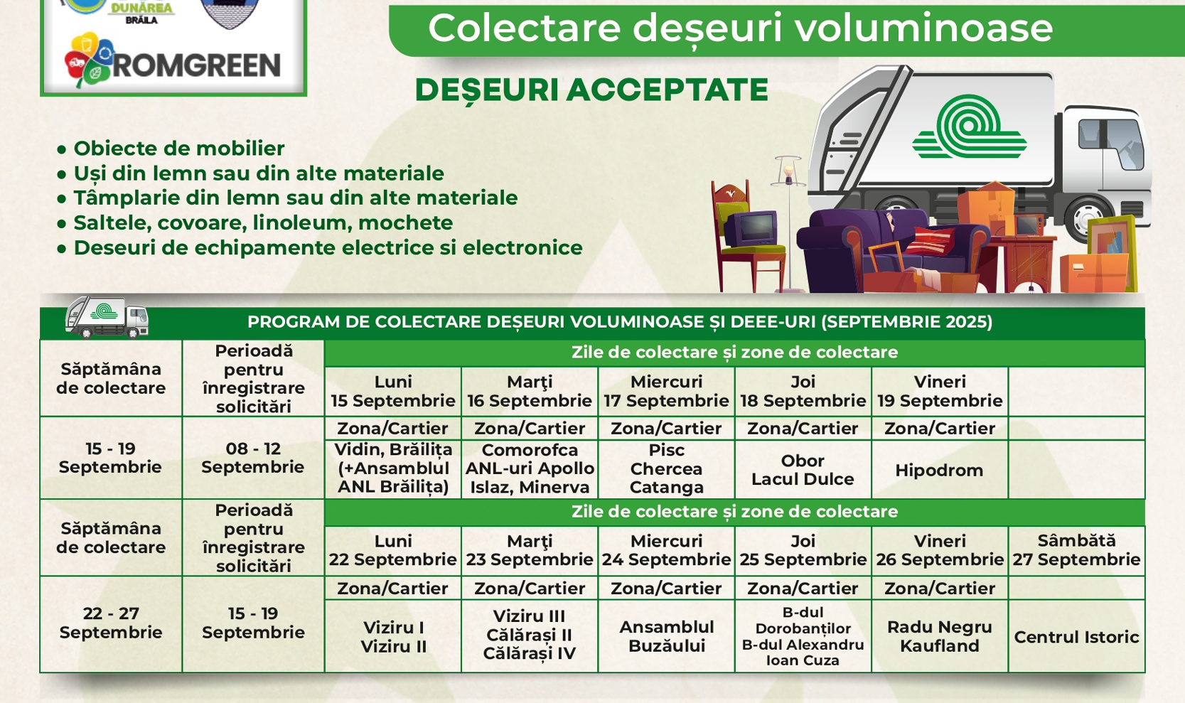 • este vorba despre deșeuri voluminoase, textile și periculoase • pe raza municipiului Brăila, campania se va derula în perioada 15 - 27 septembrie, conform graficelor atașate