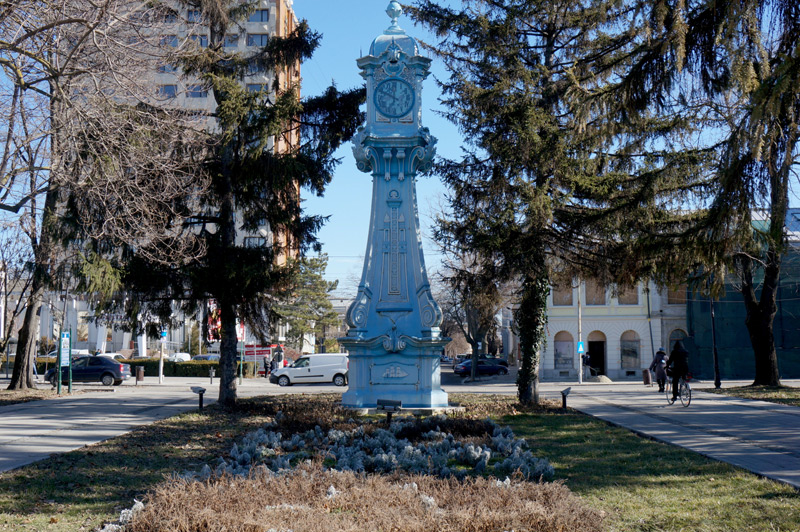 Ceasul public din Piața Traian nr. 1 este fără îndoială una dintre cele mai reprezentative construcții ale orașului, fiind un reper atât pentru localnici, cât și pentru turiști. Orologiul reprezintă o piesă de mobilier urban rară, în stil neobaroc – art noveau, stil specific decorării parcurilor și grădinilor, ridicat în anul 1909 de către firma cehă Carol Sakar, din donația lui Petru Naum, lăsată municipalității prin testament, pentru ridicarea «unui turn din metal, cu un ceasornic mare în vârf, în Piața Sf. Arhangheli Mihail și Gavril. De la început, orologiul-turn a fost considerat o piesă de mobilier urban foarte rară, deoarece, în acea epocă, ceasurile publice se montau fie în turnurile bisericilor, fie pe alte construcții administrative. Acesta este unic în România, atât prin aspectul arhitectural, cât și datorită înălțimiii sale, de aproximativ 11,50 m.