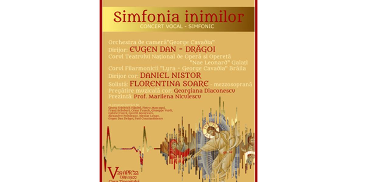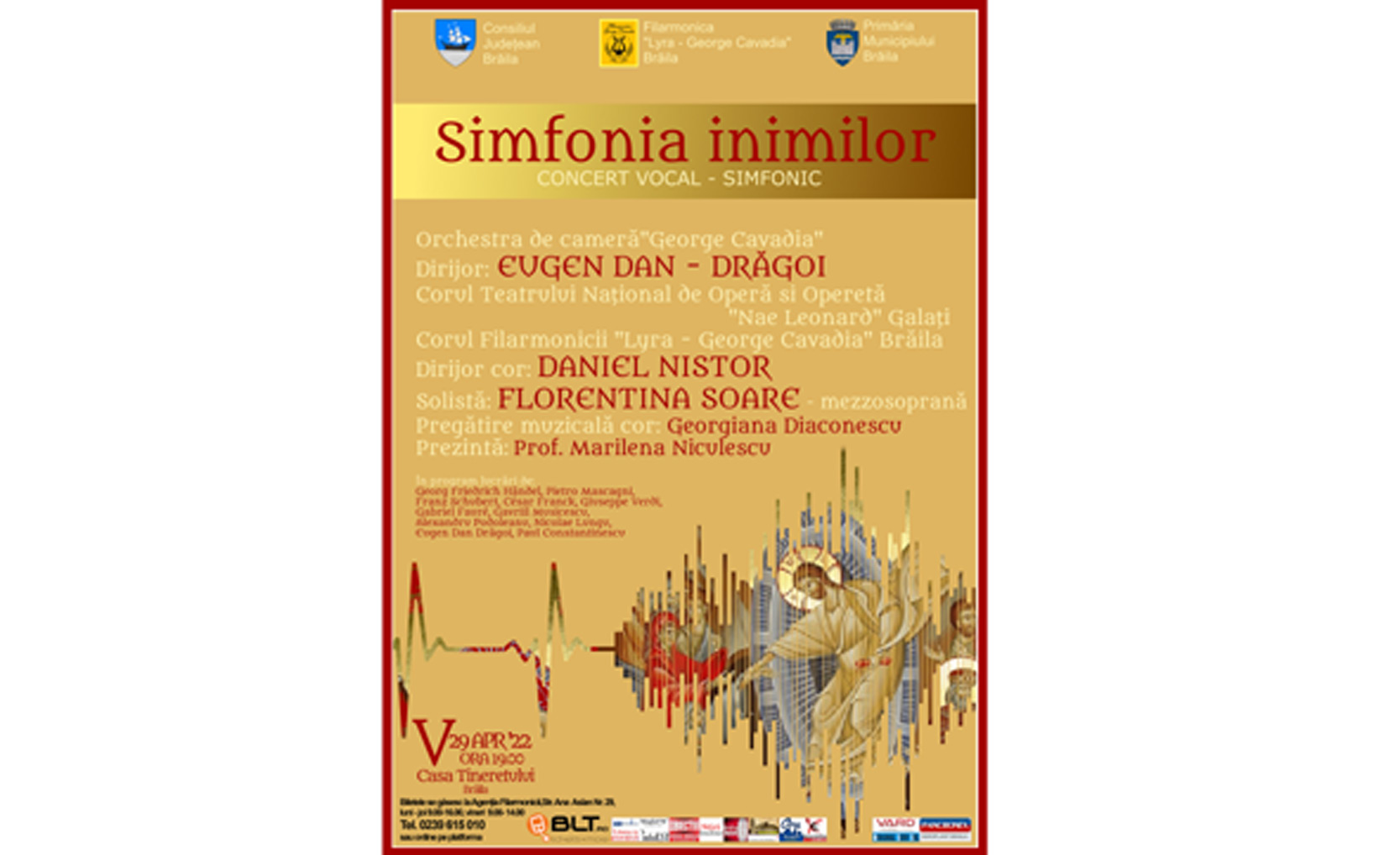 "Smerenia, speranța, bucuria se regăsesc în inimile noastre, poate, mai mult ca oricând, în Săptămâna Luminată, când înțelegem valoarea sacrificiului și ne arătăm recunoștința printr-un concert-rugăciune. Filarmonica "Lyra - George Cavadia" Brăila, împreună cu partenerii săi, Consiliul Județean și Primăria Municipiului Brăila, vă invită vineri, 29 aprilie, de la ora 19.00, la Casa Tineretului, la Concertul vocal-simfonic "Simfonia inimilor", oferit de Orchestra "George Cavadia", la pupitrul căreia se va afla maestrul Eugen Dan Drăgoi, Corul Teatrului Național de Operă și Operetă "Nae Leonard" Galați și Corul Filarmonicii "Lyra-George Cavadia" Brăila, reunite sub îndrumarea dirijorului Daniel Nistor", se precizează în comunicatul organizatorilor.