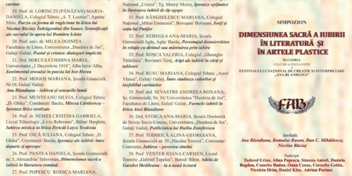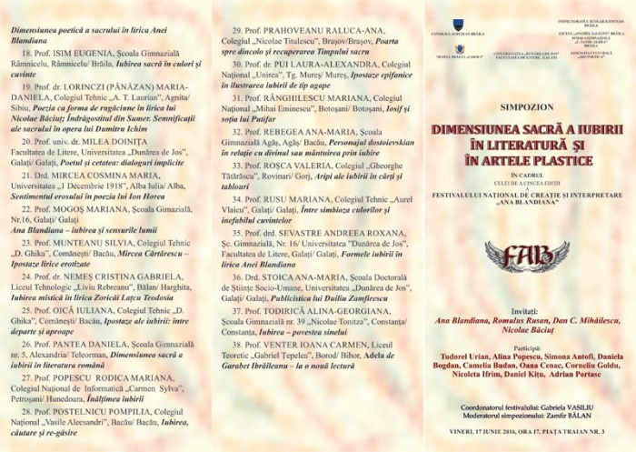 Muzeul Brăilei "Carol I", în colaborare cu Şcoala Gimnazială "Constantin Sandu Aldea" Brăila, Facultatea de Litere a Universităţii "Dunărea de Jos" Galaţi şi Asociaţia Culturală "Ars Poetica" organizează vineri, 17 iunie 2016, ora 17, la sediul Muzeului Brăilei "Carol I" din Piaţa Traian nr. 3, simpozionul "Dimensiunea sacră a iubirii în literatură şi în artele plastice", în cadrul celei de a cincea ediţii a Festivalului Naţional de Creaţie şi Interpretare "Ana Blandiana".