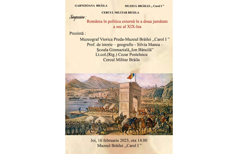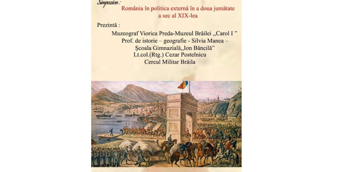 Astfel, joi, 16 februarie, de la ora 14.00, la sediul Muzeului Brăilei „Carol I”, din Piața Traian nr. 3, are loc simpozionul cu tema „România în politica externă în a doua jumătate a secolului al XIX-lea”. Evenimentul este organizat de Secția Istorie Modernă și Contemporană a Muzeului Brăilei „Carol I” în colaborare cu Școala Gimnazială „Ion Băncilă” și Cercul Militar Brăila și va fi prezentat de Viorica Preda, muzeograf la Secția Istorie Modernă și Contemporană, Silvia Manea, profesor de istorie și geografie la Școala „Ion Băncilă” și locotenent-colonel în retragere Cezar Postelnicu, din cadrul Cercului Militar Brăila.