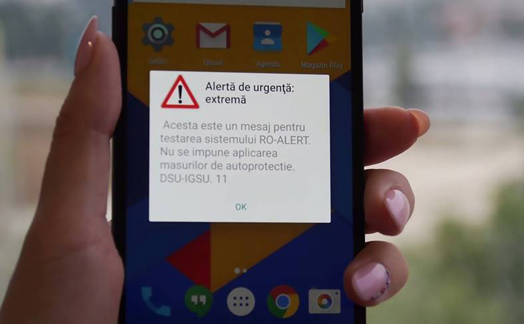 Telefoanele configurate pentru recepţia medajelor RO-ALERT şi care se vor afla în aria de acoperire a celulelor din zonele selectate pentru testare vor recepţiona următorul mesaj “TEST! Acesta este un mesaj pentru testarea sistemului RO-ALERT. Nu se impune aplicarea măsurilor de autoprotecţie”.