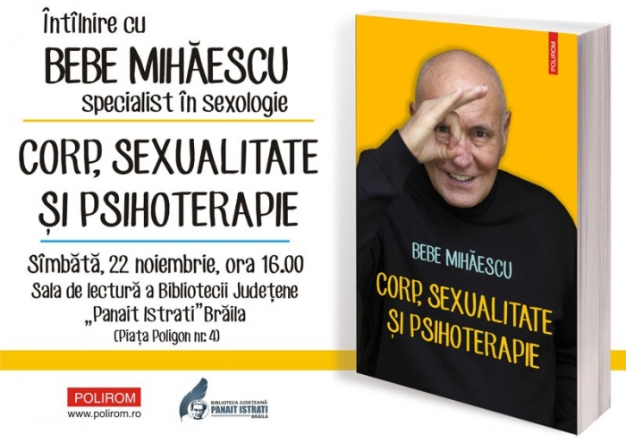 Sâmbătă, de la ora 16.00, la Biblioteca Judeţeană se va lansa cartea "Corp, sexualitate şi psihoterapie" semnată de cunoscutul sexolog Bebe Mihăescu.