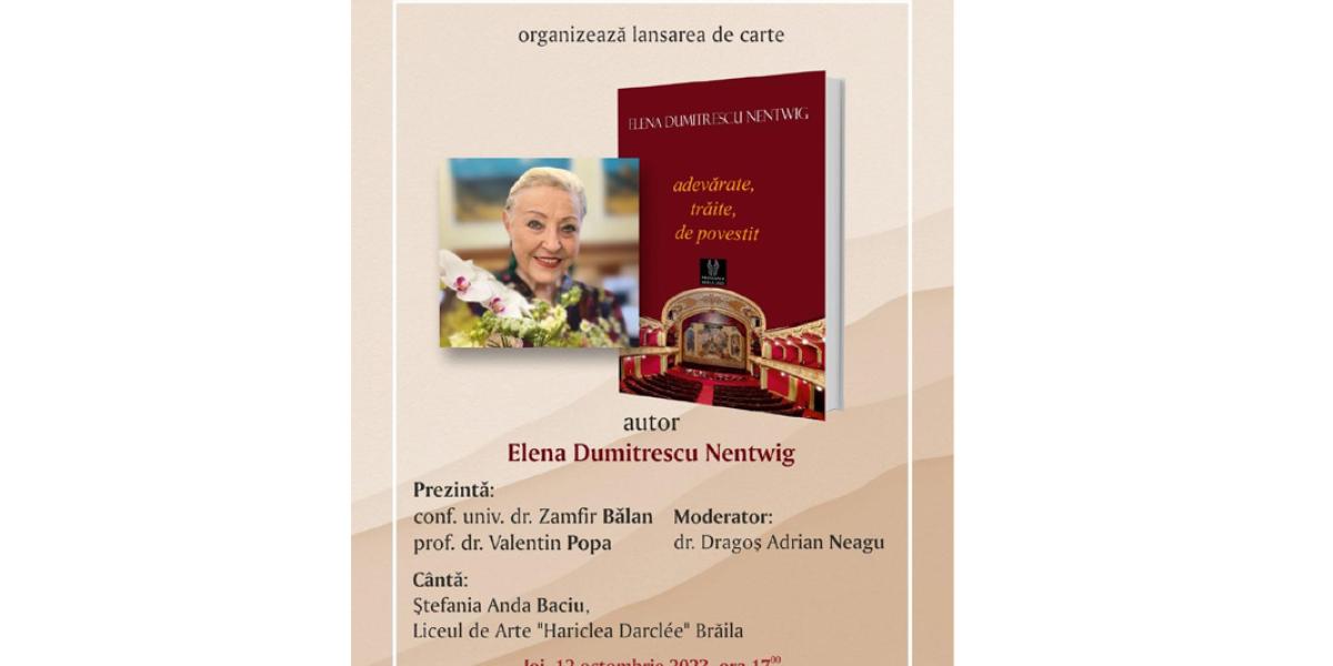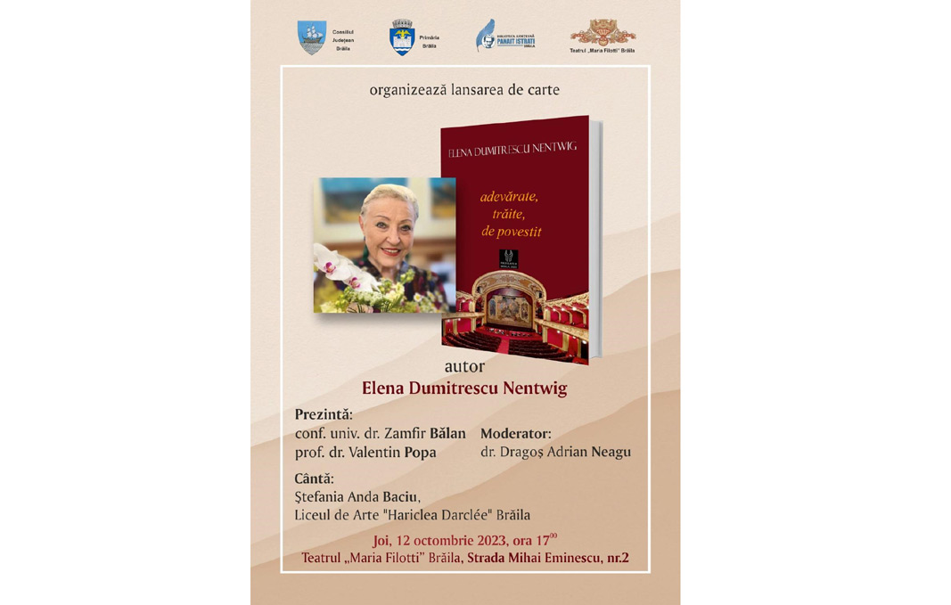 Biblioteca Județeană “Panait Istrati” Brăila, în colaborare cu Teatrul “Maria Filotti” vă invită joi, 12 octombrie 2023, ora 17.00, la lansarea cărții “Adevărate, trăite, de povestit” scrisă de soprana Elena Dumitrescu Nentwig. Evenimentul are loc la Teatrul “Maria Filotti”, iar intrarea publicului este liberă.