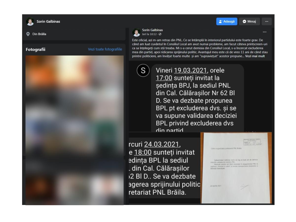 ”Este oficial, azi (luni, 26 aprilie) m-am retras din PNL. Ce se întâmplă în interiorul partidului este foarte grav. De când am luat cuvântul în Consiliul Local am avut numai probleme, am făcut câteva printscreen-uri ca să înţelegeţi cum stă treaba. Mi s-a cerut demisia din Consiliul Local, s-a încercat excluderea mea din partid, apoi ridicarea sprijinului politic. Avantajul meu este că, de vreo 11 ani de când stau printre politicieni, am învăţat foarte multe şi am «supravieţuit» acestor propuneri venite pe rând de la Boboc, de la Canciu sau amândoi în acelaşi timp, era un fel de concurs, cine-l dă mai repede afară pe Gălbinaş, sunt şi înregistrări, dar nu-i cazul. Am aşteptat deciziile finale, înştiinţările în scris cu motivele eliminării mele, dar s-au răzgândit sau mai bine zis i-am făcut să se răzgândească….vin alegeri interne şi am ceva influenţă. În prezent, PNL Brăila este condus de oameni pe persoană fizică, care nu au făcut nimic notabil în viaţa lor, doar declaraţii şi poze (cu o excepţie, Canciu, care între timp a schimbat stăpânul), iar eu nu-mi pot asocia imaginea cu astfel de personaje care nu respectă nimic, statut, principii, valori, oameni…nimic”, a scris Gălbinaş pe pagina sa de Facebook.