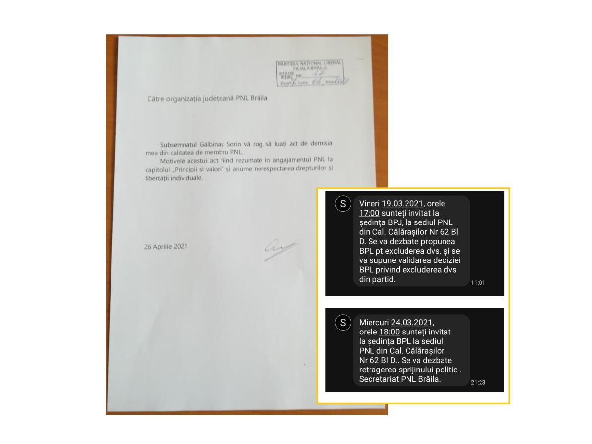 Acesta a postat şi fotografii cu demisia sa, dar şi cu mesaje primite pe telefon prin care fusese chemat la şedinţe ale birourilor politice ale organizaţiei în care urma să se dezbată de mai multe ori la rând excluderea sa. Gălbinaş a vorbit despre opoziţie constructivă, făcând precizarea că din punctul său de vedere se pot face lucruri chiar şi dintr-o astfel de poziţie pentru cetăţeni, însă nu se doreşte acest lucru de către actuala conducere interimară.