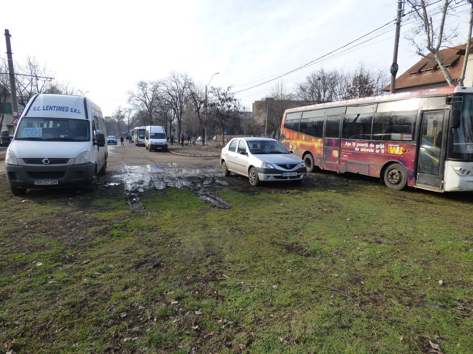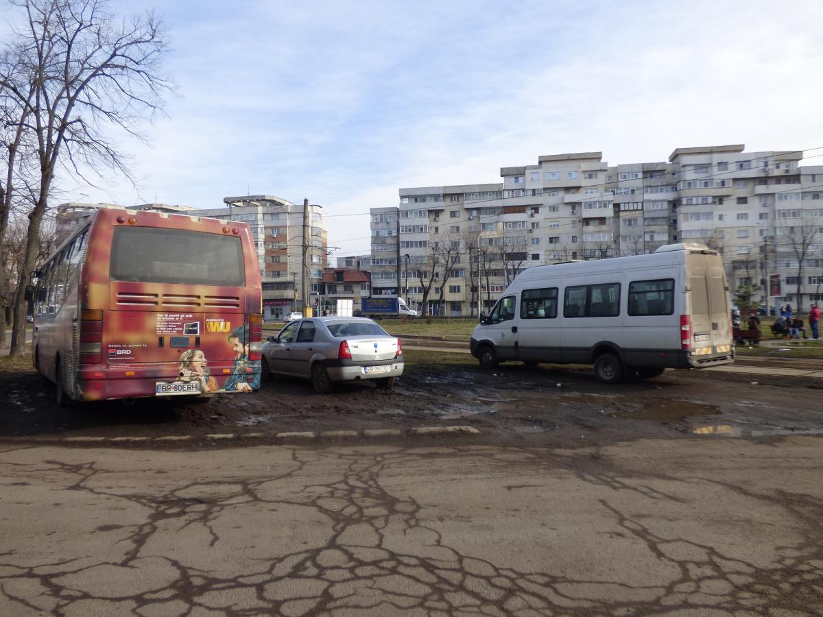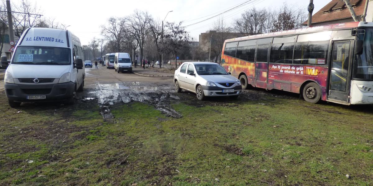 • este vorba despre zona de lângă dispeceratul “Braicar”, unde numeroase autobuze, microbuze şi chiar autoturisme particulare sunt parcate zilnic pe ceea ce ar trebui să fie un spaţiu verde • care, însă, începe să semene mai degrabă a arătură • asta în timp ce locurile destinate parcării sunt fie ocupate de utilaje de intervenţie, fie sunt inutilizabile, din cauza gropilor tot mai mari din asfalt