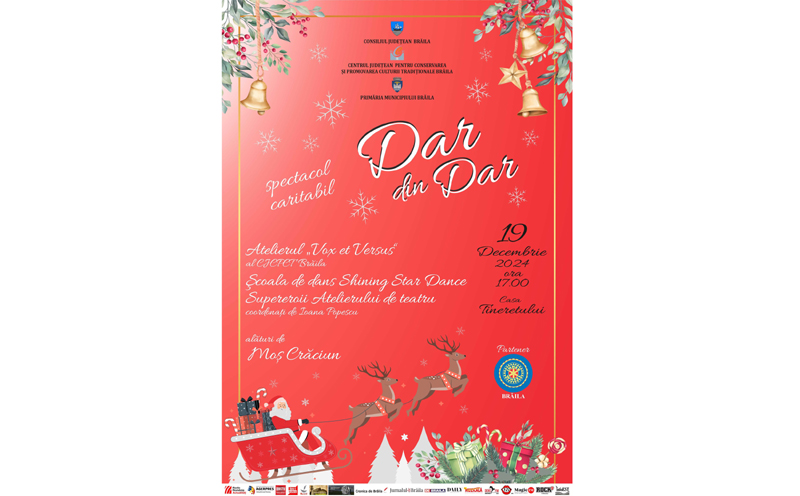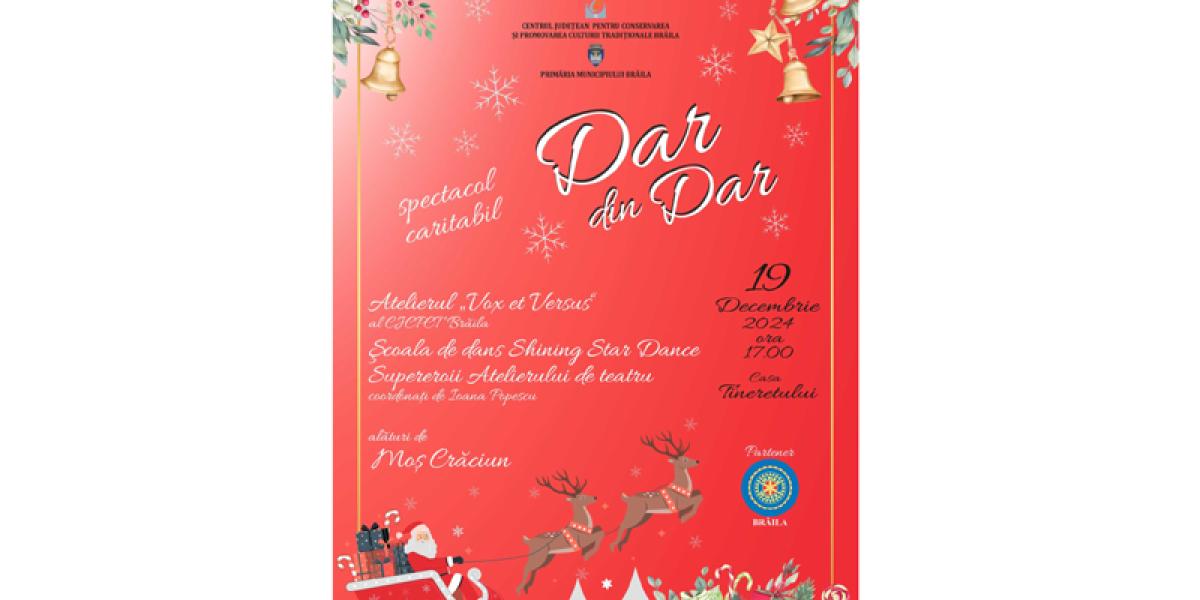Consiliul Județean Brăila - prin Centrul Județean pentru Conservarea și Promovarea Culturii Tradiționale - și Primăria Municipiului Brăila, cu sprijinul organizației „Inner Wheel”, organizează, în ziua de 19 decembrie, începând cu ora 17:00, evenimentul cultural caritabil „Dar din dar!” - un spectacol de muzică, teatru și dans menit să aducă un dram de bucurie în inimile celor afectați de incendiul din data de 5 noiembrie a.c. Este vorba de membrii familiei Constantin, greu încercați de soartă, a căror casă a ars din temelii.