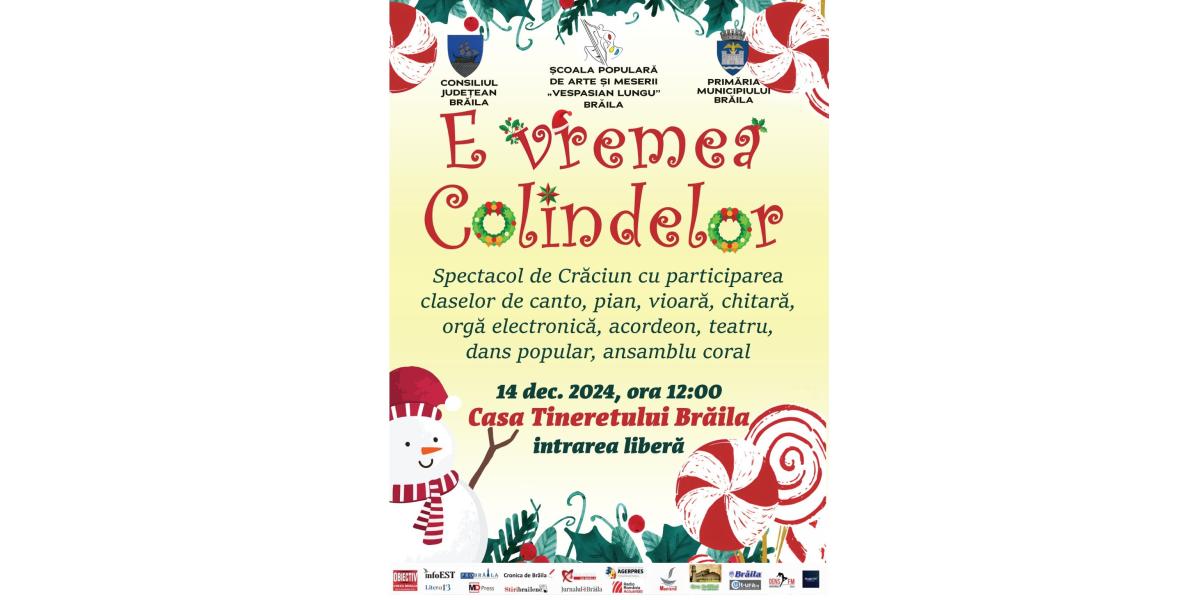 Evenimentul va avea loc sâmbătă, 14 decembrie, începând cu ora 12:00, în sala de spectacole a Casei Tineretului de pe Calea Călărașilor, iar intrarea este liberă. Participă elevii claselor de canto, pian, vioară, chitară, orgă electronică, acordeon, teatru, dans popular și ansamblu coral de la Școala Populară de Arte „Vespasian Lungu” Brăila, împreună cu profesorii coordonatori.