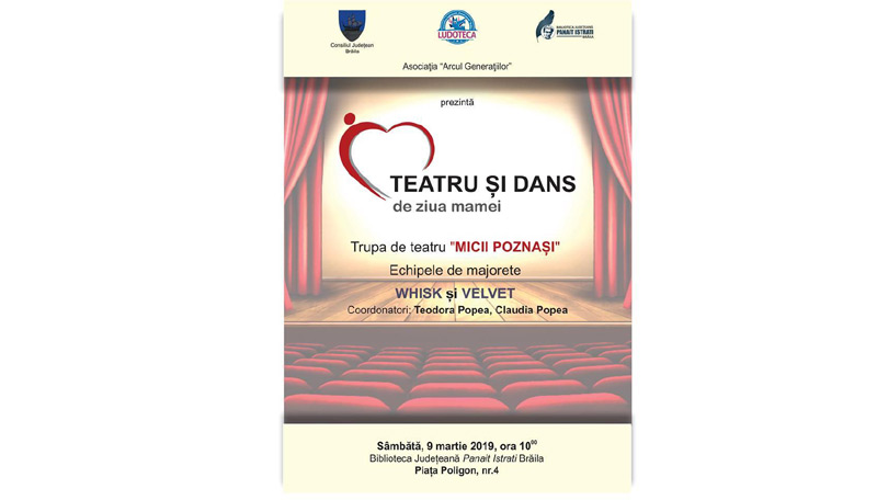 Sâmbătă, 9 martie 2019, de la ora 10.00, la Biblioteca Judeţeană “Panait Istrati” Brăila va avea loc un spectacol de teatru şi dans, organizat de instituţia gazdă în colaborare cu Asociaţia “Arcul Generaţiilor”. Membrii trupei de teatru “Micii Poznaşi” vor susţine în faţa publicului două poveşti clasice: “Cenuşăreasa” şi “Scufiţa roşie”, prezentate sub formă de pantomimă muzicală. În această formă de spectacol replicile actorilor sunt înlocuite de fragmente muzicale ca o nouă modalitate de a spune o poveste, provocând imaginaţia şi talentul tinerilor actori, aceştia spunând o poveste fără a-şi folosi vocea. În distribuţie: Andrei Turcu, Irina Neculai, Roxana Dan, Teodora Burlacu, Victor Economu, Ştefania Culea, Luca Nicolae, Cristina Constantin, Iustina Iorga, Cristina Vişinescu. Coordonatoarea trupei de teatru este Teodora Popea, studentă la Facultatea de Regie, Film şi Televiziune.
