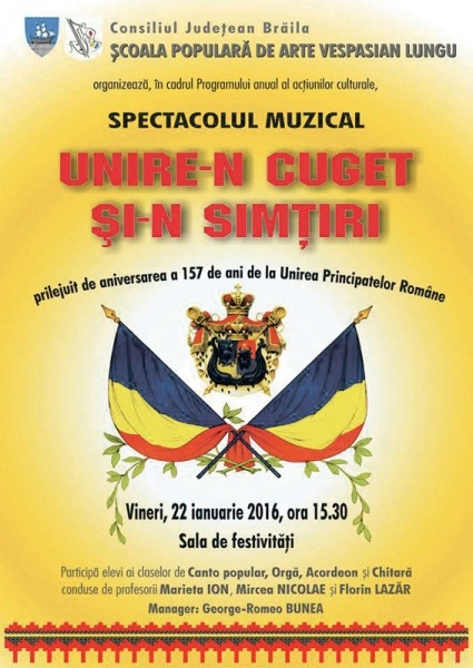 Vineri, 22 ianuarie 2016, începând cu ora 15.30, în sala festivităţi a Şcolii Populare de Arte „Vespasian Lungu" Brăila se va desfăşura spectacolul muzical „Unire-n cuget şi-n simţiri", prilejuit de aniversarea a 157 de ani de la Unirea Principatelor Române. Spectacolul va fi susţinut de elevi ai claselor de Canto popular, Orgă, Acordeon şi Chitară conduse de profesorii Marieta Ion, Mircea Nicolae şi Florin Lazăr, iar programul include dansuri tradiţionale, cât şi interpretarea unor piese de muzică populară şi folk.