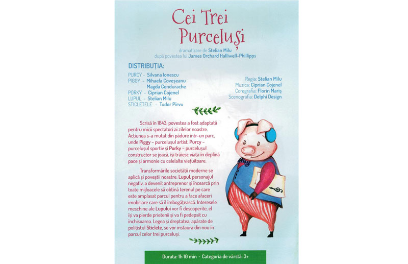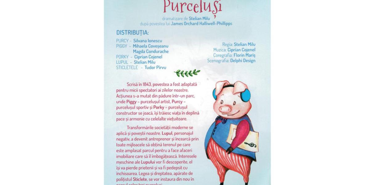 Teatrul Excelsior din Bucureşti organizează, pe data de 14 decembrie 2016, două reprezentaţii ale spectacolului pentru copii „Cei trei purceluşi” după James Orchard Halliwell-Phillipps, la Palatul „Lyra”, de la ora 09.30, respectiv de la ora 11.00.