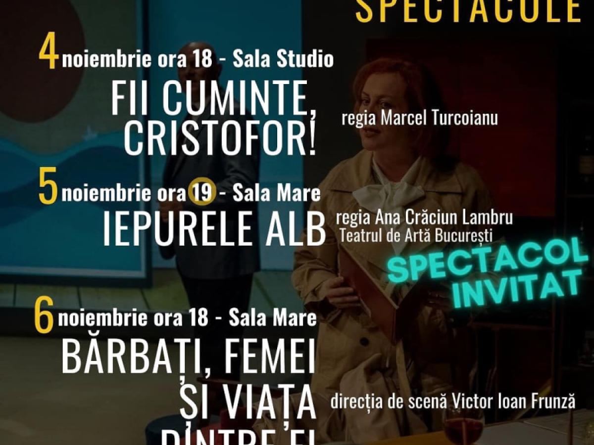 * vineri, 4 noiembrie, se joacă “Fii cuminte, Cristofor!” (regia Marcel Turcoianu), iar duminică, 6 noiembrie, sunteți așteptați la comedia ”Bărbați, femei și viața dintre ei” (direcția de scenă Victor Ioan Frunză) * sâmbătă, 5 noiembrie, Teatrul de Artă din București vine la Brăila pentru a-i oferi publicului ocazia de a vedea un spectacol pentru toată familia: “Iepurele alb”, regia Ana Crăciun Lambru