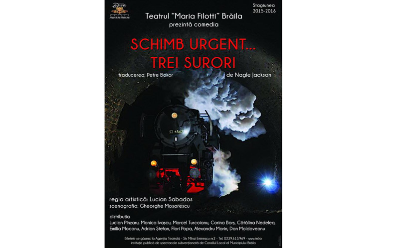 Teatrul “Maria Filotti” participă la secţiunea concurs cu spectacolul “SCHIMB URGENT ...TREI SURORI”, o comedie aspră americană, contemporană, de Nagle Jackson, duminică, 8 octombrie, de la ora 19.30. Regia artistică este semnată de managerul teatrului Lucian Sabados, scenografia aparţine lui Gheorghe Mosorescu, coregrafia a fost realizată de Liliana Stan, iar aranjamentele muzicale sunt concepute de compozitorul şi pianistul Cornel Cristei. Spectacolul “Schimb urgent...trei surori” aduce la rampă o distribuţie de îndrăgiţi şi talentaţi actori precum: Monica Ivaşcu, Marcel Turcoianu, Corina Borş, Cătălina Nedelea, Emilia Mocanu, Adrian Ştefan, Flori Popa, Dan Moldoveanu şi Alexandru Marin, alături de Lucian Pînzaru, actor al dramaticului gălăţean.
