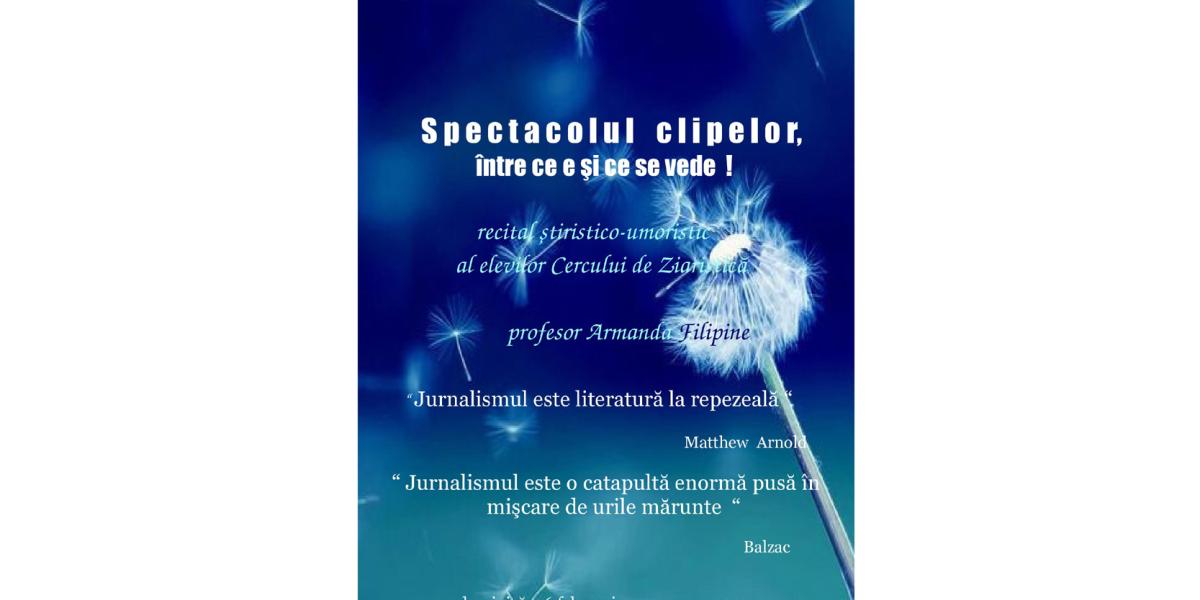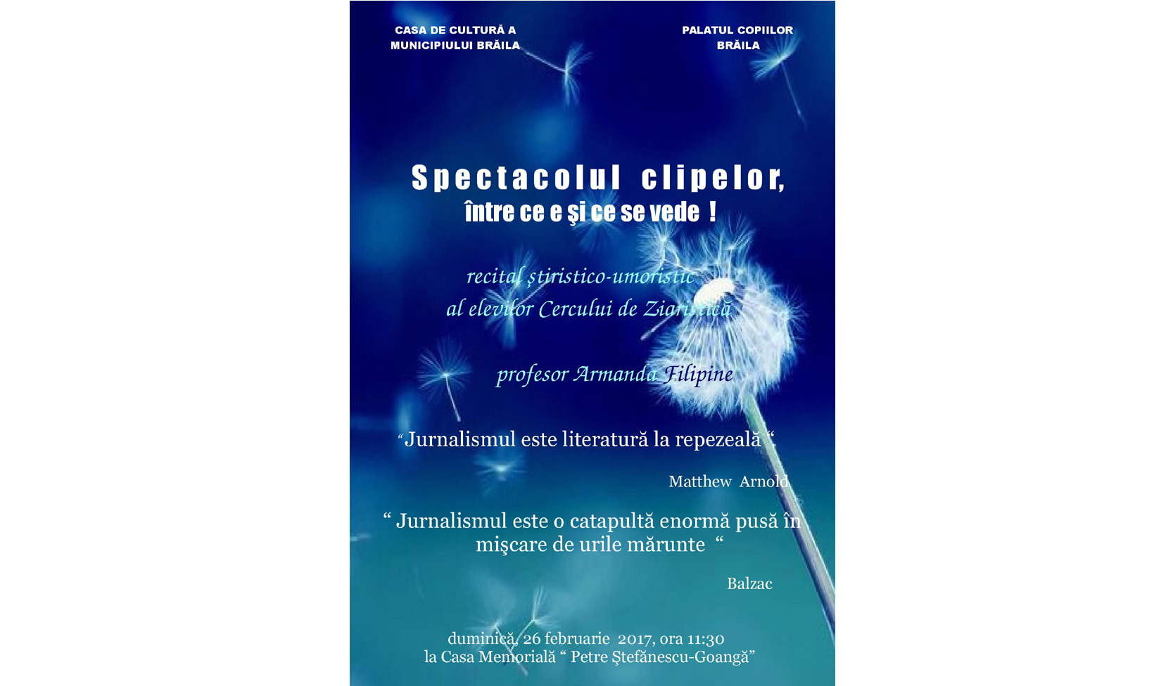 Duminică, 26 februarie 2017, de la ora 11.30, membrii Cercului de Ziaristică de la Palatul Copiilor Brăila vor susţine, la Casa Memorială Petre Ştefănescu-Goangă, un recital ştiristico-umoristic, intitulat Spectacolul clipelor, între ce e şi ce se vede!, pentru a sublinia sărbătorile tradiţionale populare Dragobete şi Mărţişorul. În cadrul spectacolului, tinerii jurnalişti, coordonaţi de prof. Armanda Filipine, vor încerca să demonstreze părinţilor, profesorilor şi publicului că au înţeles impactul pe care lumea ştirilor îl are în viaţa noastră.