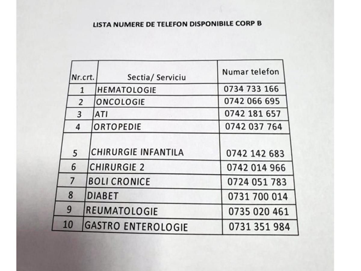 • rețeaua de telefonie fixă a Spitalului Clinic Județean de Urgență Brăila a fost serios afectată din cauza unor hoți care au furat un cablu de telecomunicații • dacă la Corpul A al spitalului problema a fost remediată a doua zi, la Corpul B situația a persistat până ieri, la orele prânzului, când managerul unității spitalicești ne-a transmis că a găsit o soluție provizorie • alăturat veți găsi o listă cu noile numere de telefon de la spital la care puteți suna dacă doriți informații despre un pacient din Corpul B (fostul Spital 3)