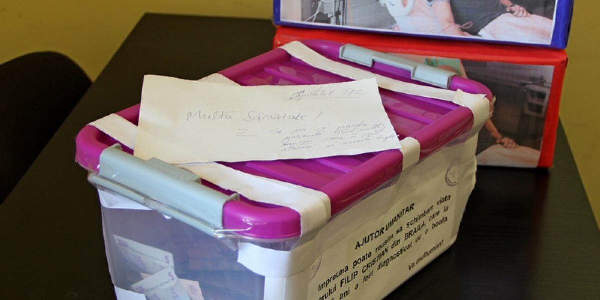 Spitalul de Pneumoftiziologie Brăila (TBC) se alătură campaniei umanitare pentru Cristian Filip. Angajaţii spitalului au realizat o urnă în care au donat bani pentru ca adolescentul diagnosticat cu o formă rară de cancer să se poată recupera. În total s-au strâns 751 lei, bani ce au fost aduşi vineri la redacţia noastră. Donatorii i-au transmis lui Cristi multă sănătate şi să nu îşi piardă speranţa pentru că sunt mulţi oameni alături de el în această luptă.