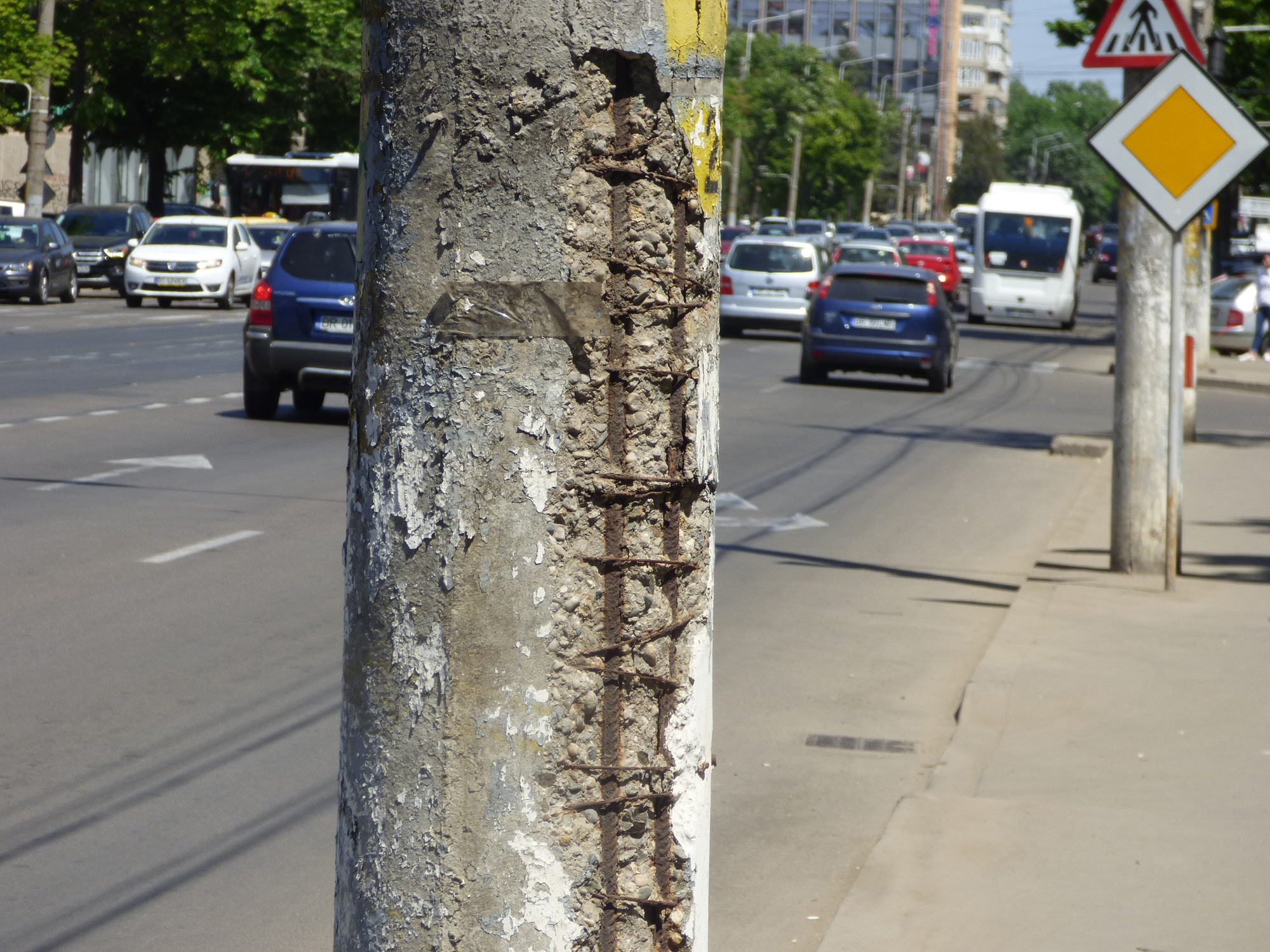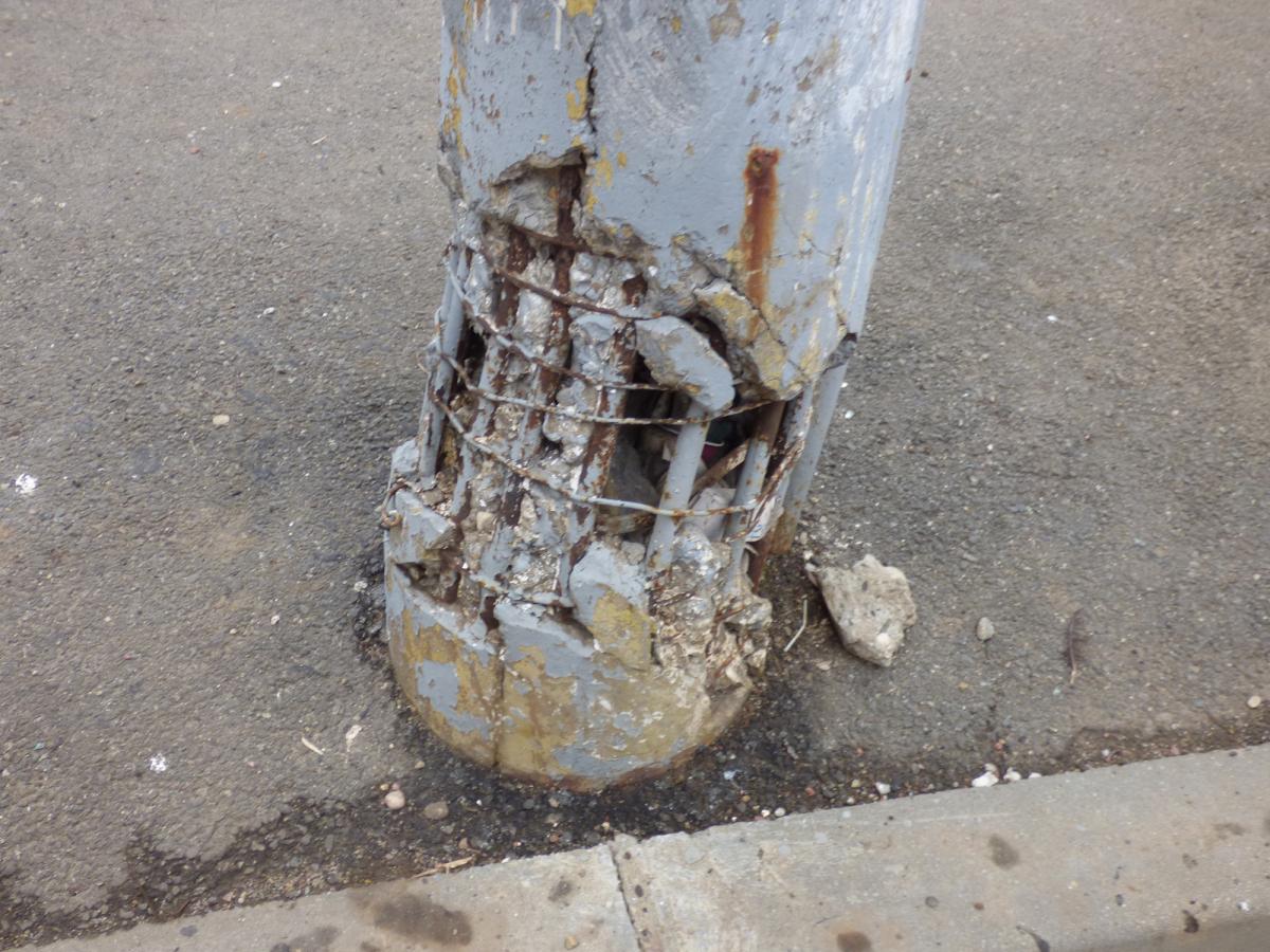 O altă categorie de stâlpi sunt cei avariaţi în accidente rutiere, care au fost întăriţi cu un brâu din beton sau metal.