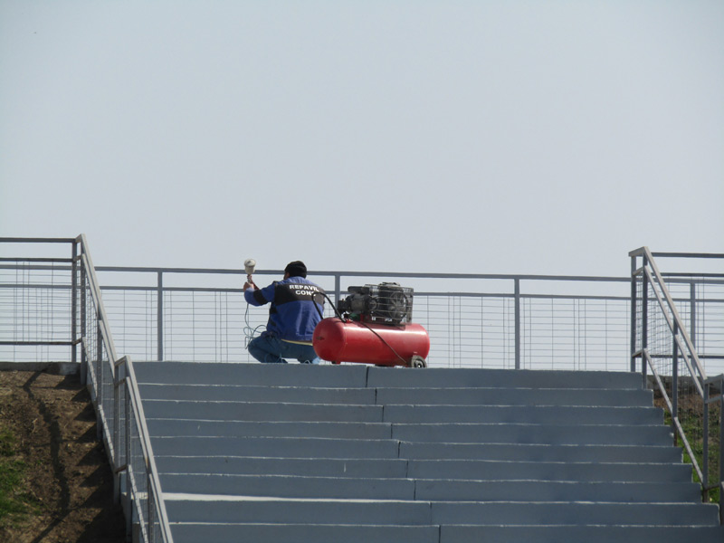 Zilele trecute, câțiva muncitori lucrau pe taluzul stadionului, cu vedere la Calea Galați. Unii vopseau balustradele și gardurile din plasă, alții făceau curățenie pe taluz. Urma, probabil, să se astupe denivelările existente pe taluz și să se procedeze la înierbarea acestuia cu gazon de calitate.