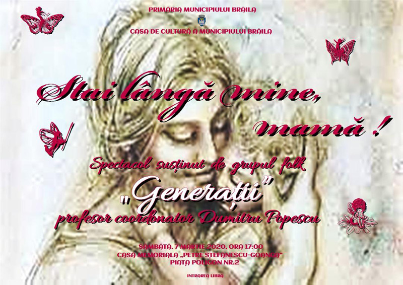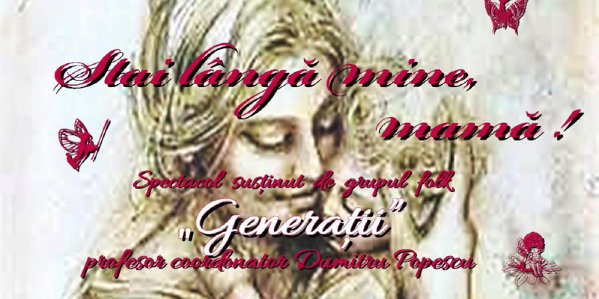 În cadrul spectacolului intitulat Stai lângă mine, mamă!, cei mai mici membri ai Grupului folk Generaţii, coordonaţi de profesorul Dumitru Popescu, vor interpreta cântece pentru mamele, bunicile şi surorile lor, pe versurile unora dintre cei mai de seamă poeţi români - Zaharia Stancu, Virgil Carianopol, George Topârceanu, Otilia Cazimir, Ştefan Octavian Iosif, Grigore Vieru, Dumitru Matcovski.