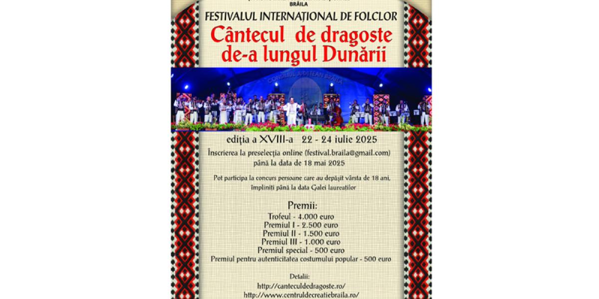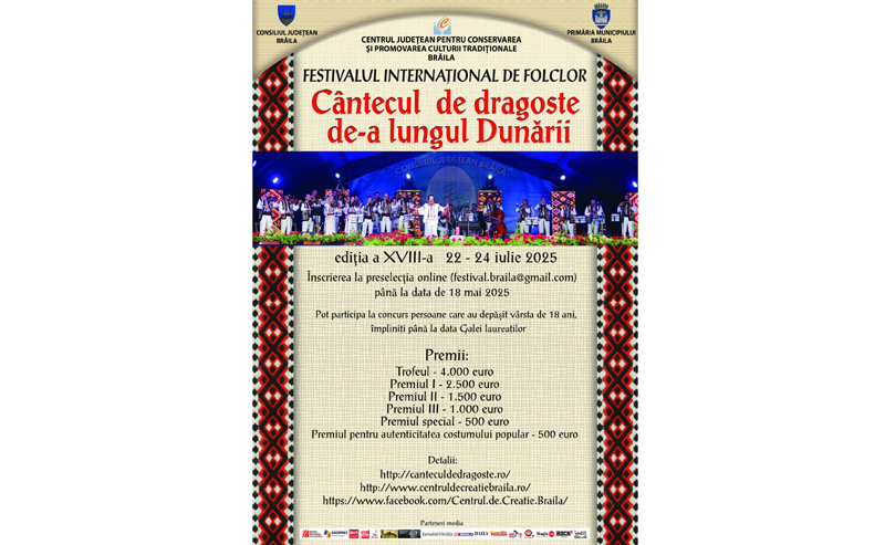 Organizat, an de an, de Consiliul Județean Brăila, prin Centrul Județean pentru Conservarea și Promovarea Culturii Tradiționale, alături de Primăria Municipiului Brăila, pe scena de la Esplanada Dunării, Festivalul „Cântecul de dragoste de-a lungul Dunării” a ajuns, iată, la cea de-a XVIII-a ediție.