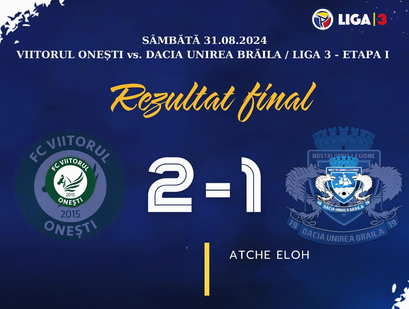 Dacia Unirea a început bine partida din deplasare la Viitorul Onești, în etapa inaugurală a Ligii a III-a, ediția 2024-2025, a condus cu 1-0 și spera într-un rezultat pozitiv. În minutul 7, formația de la Dunăre a beneficiat de o lovitură liberă, Oniciu a trimis mingea în careul gazdelor iar Eloh a deschis scorul.