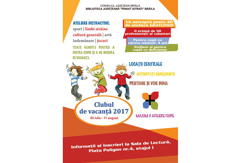 Biblioteca Judeţeană “Panait Istrati” Brăila organizează şi în acest an ediţia de vară a Clubului de Vacanţă. Pentru al patrulea an consecutiv, instituţia de cultură oferă copiilor urbei o seamă de activităţi de petrecere a timpului liber şi de învăţare prin joc, în cadrul CLUBULUI DE VACANŢĂ.