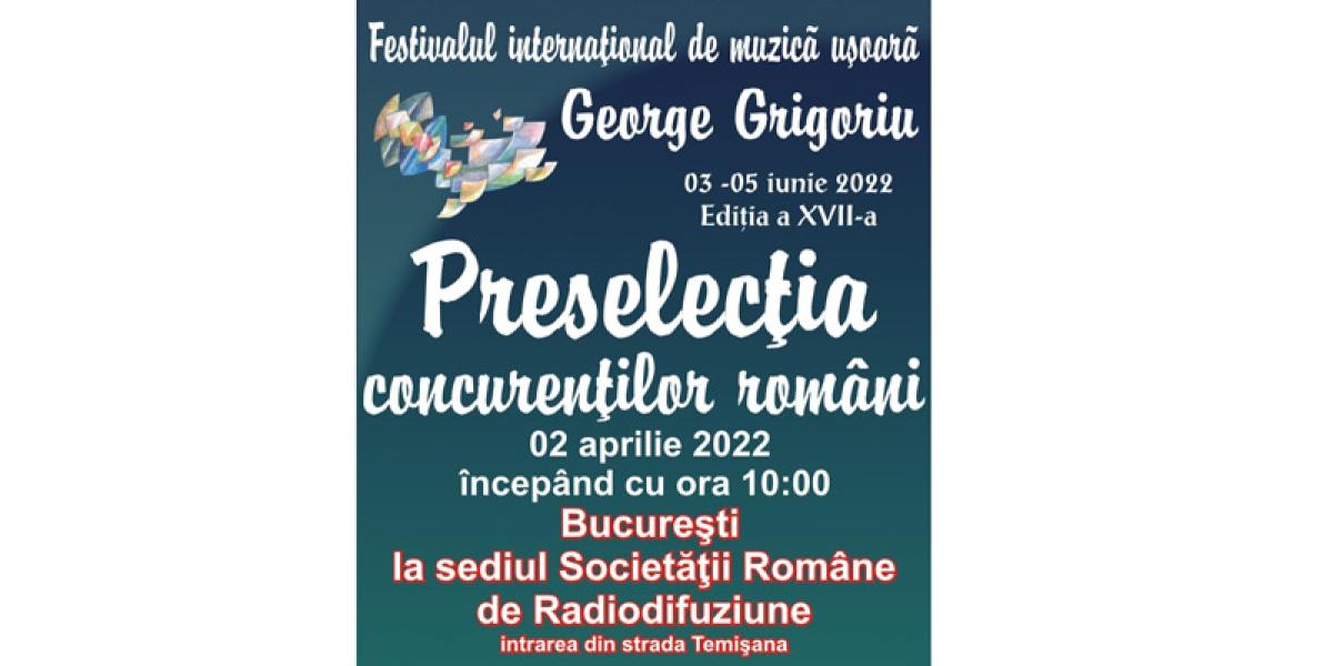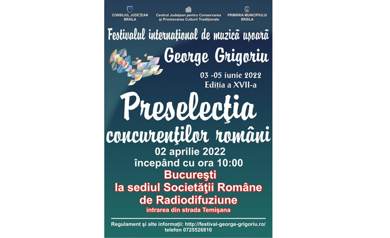 Centrul Județean pentru Conservarea și Promovarea Culturii Tradiționale Brăila (CJCPCT - Centrul de Creație), Primăria Municipiului și Consiliul Județean Brăila - organizatorii Festivalului Internațional de Muzică Ușoară "George Grigoriu"-Ediția a XII-a - au decis că, dată fiind încetarea stării de alertă, preselecția concurenților români se va face atât prin transmiterea dosarului de înscriere pe email, cât și prin prezența obligatorie la București, pe 2 aprilie a.c., în fața juriului de preselecție.