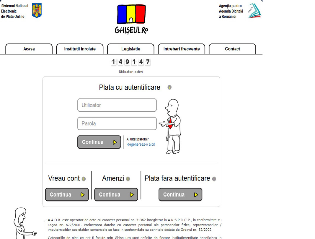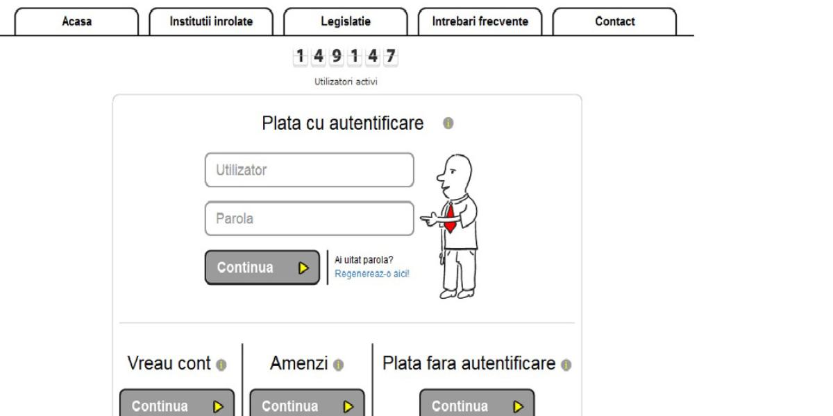 Mai trebuie spus că prin secţiunea “Plată cu autentificare” utilizatorul are posibilitatea de consultare a obligaţiilor de plată datorate instituţiilor înrolate şi achitarea acestora prin plată online cu cardul (Visa, Visa electron, Mastercard, Maestro). Sunt acceptate la plată cardurile emise de toate băncile din România, dacă respectivele carduri sunt înrolate 3D Secure. Instituţiile de credit pot impune limitări la plăţile prin internet (suma maximă, număr de tranzacţii), iar informaţii privind aceste limitări sunt disponibile numai la banca emitentă a cardului.