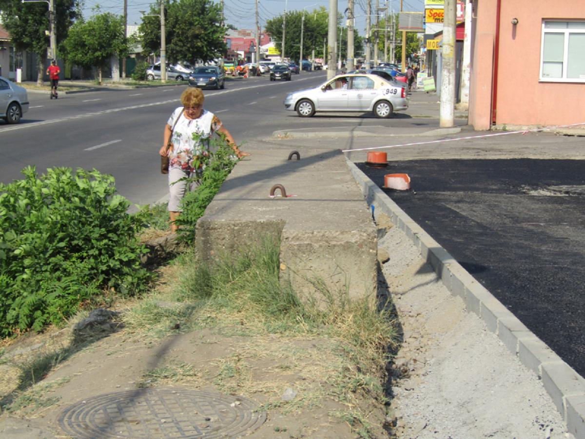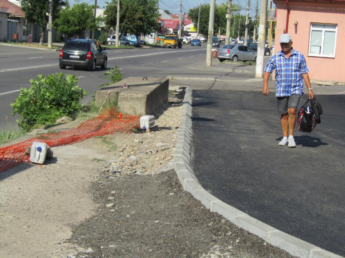 De fapt, în respectiva zonă lipseşte semnalizarea, dar şi marcajul rutier. Deci, o situaţie unică, iar cât priveşte sistematizarea pe verticală, în urma onor constructorilor au rămas alte belele: resturi de asfalt îngheţat, bucăţi de material plastic de la ajustarea canalizărilor, găleţi turtite și gunoi. Şi, tot în neregulă, spre nemulţumirea şi periclitarea pietonilor: acea zonă de trotuar neterminat, porţiuni mari cu gropi, pietriş lângă bordură, asfalt aruncat aiurea, acolo unde trebuie să fie trotuarul care, nu-i aşa, se înfundă în amintitul obstacol din beton.