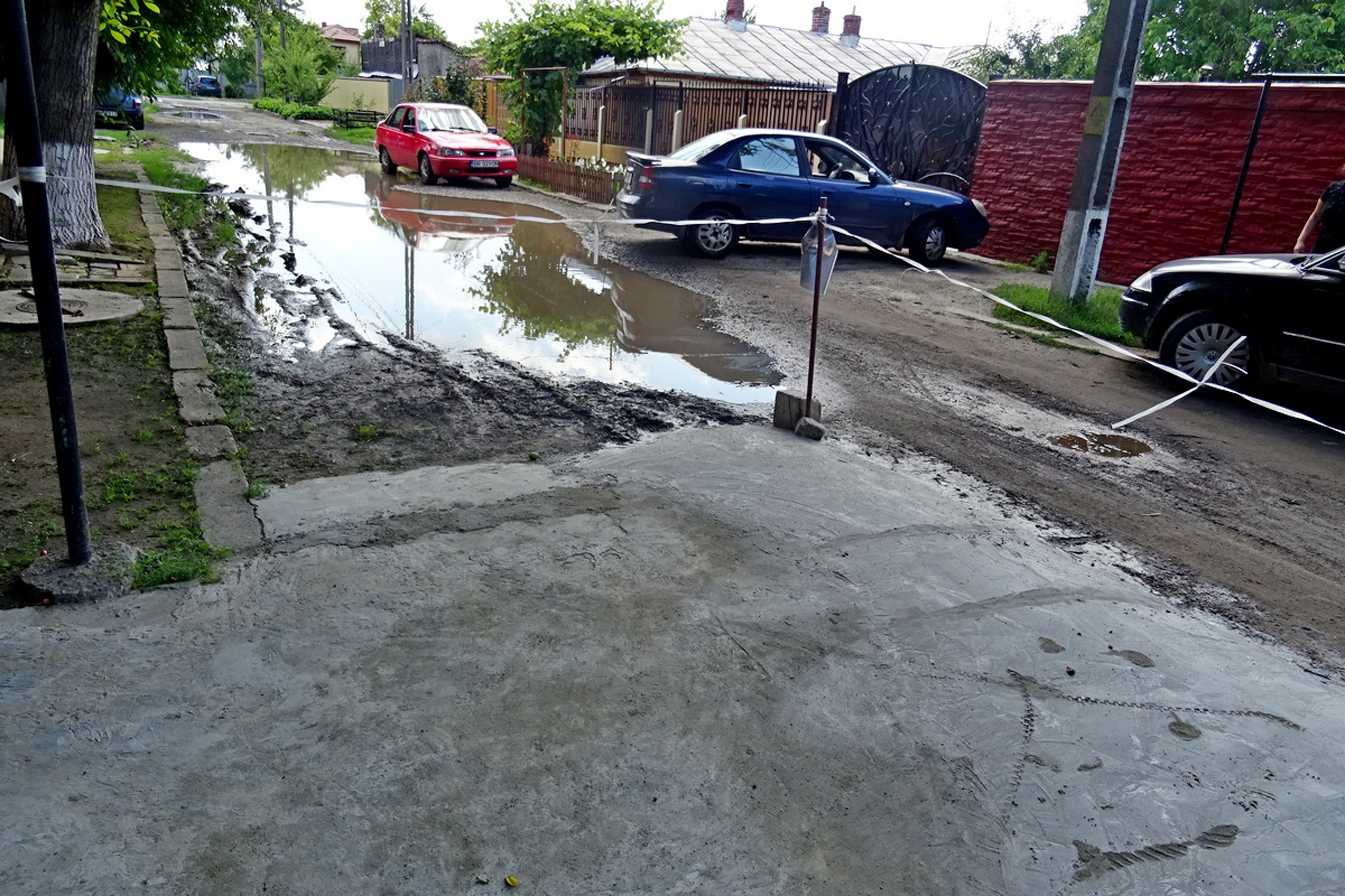 Sătul să mai “înoate” prin noroaie de fiecare dată când plouă, un brăilean şi-a rupt din bugetul familiei o sumă destul de consistentă, pentru a-şi turna în faţa porţii un planşeu de beton care depăşeşte limita trotuarului, ajungând până la jumătatea părţii carosabile a străzii. Oricine încearcă să circule cu maşina pe strada respectivă de la marginea cartierului Chercea înţelege pe deplin gestul cetăţeanului cu pricina. După precipitaţiile abundente de la sfârşitul săptămânii trecute, strada Dornelor s-a umplut de apă de la un trotuar la altul, transformându-se într-o adevărată albie. Ieri, deşi s-au mai retras, bălţile continuau să fie descurajante, atât pentru şoferi cât şi pentru pietoni. Locatarii străzii în cauză se plâng că lucrurile stau atât de rău de câţiva ani, mai exact de când firma “Tancrad” a făcut săpături în zonă pentru montarea unor conducte de canalizare. “După săpăturile acelea, s-a terminat cu strada noastră... E nenorocire, mergem în apă până la genunchi după ce plouă. Copiii noştri nici nu au unde să se joace, trebuie să plece pe alte străzi, că aici n-au cum, din cauza noroiului şi a apei. Eu am tot trimis sesizări pe adresa Primăriei, dar n-am primit niciun răspuns. Am mai intervenit noi, locatarii, săpând nişte şanţuri de scurgere spre căminele de canalizare, ca să nu mai băltească apa zile la rând. Aşa, se retrage mai repede, dar tot stăm cu bălţile în faţa porţii câteva zile. Am fi vrut să punem mână de la mână şi să împrăştiem un strat de pietriş pe stradă, dar ne-au spus de la Primărie că n-avem voie, că ne amendează”, ne-a spus Elena Dimache, unul dintre locatarii nemulţumiţi.