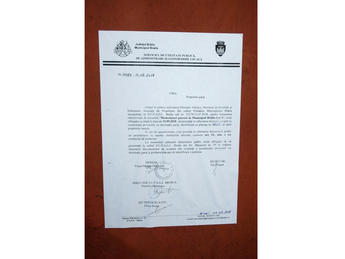 În 2017, pe raza municipiului Brăila erau înregistrate 2.268 de garaje amplasate pe domeniul public. La începutul anului în curs, toţi proprietarii au fost obligaţi să îşi reînregistreze garajele, printr-o procedură destul de stufoasă, aceştia trebuind să se prezinte la SUPAGL cu o serie de acte, ce includea, printre altele, certificatul de amplasare, numărul plăcuţei de identificare, copie după talonul maşinii, dovada valabilităţii Inspecţiei Tehnice Periodice şi, nu în ultimul rând, o declaraţie pe proprie răspundere autentificată de un notar, în care proprietarul garajului menţiona suprafaţa ocupată pe domeniul public.