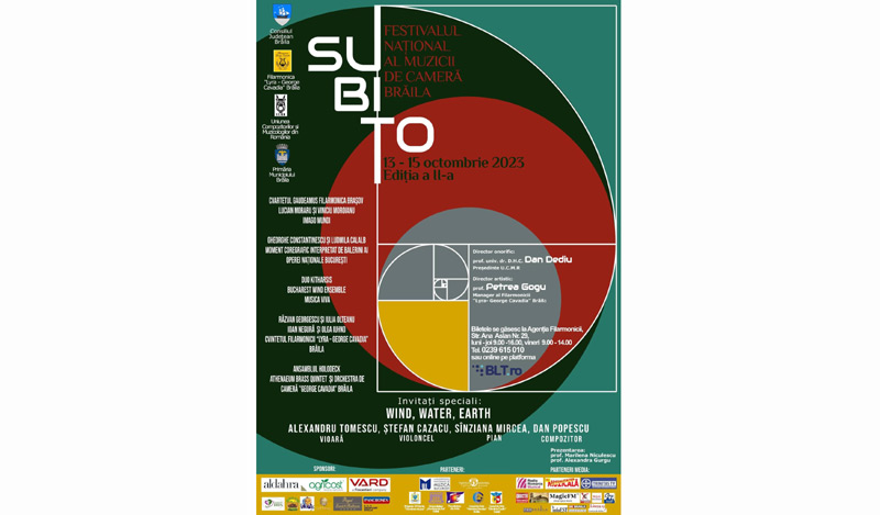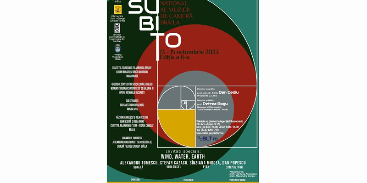 Filarmonica „Lyra-George Cavadia” Brăila, alături de Consiliul Județean Brăila, Primăria Municipiului Brăila și Uniunea Compozitorilor și Muzicologilor din România, organizează, în perioada 13-15 octombrie 2023, cea de-a II-a ediție a Festivalul Național al Muzicii de Cameră SUBITO. Prezentarea spectacoelor va fi făcută de prof. Marilena Nicușescu și prof. Alexandra Gurgu. Biletele au fost puse în vânzare la agenția Filarmonicii, din Strada Ana Aslan nr. 29 sau online de pe platforma BLT.ro. https://www.blt.ro/subito-festivalul-national-al-muzicii-de-camera-braila.html.