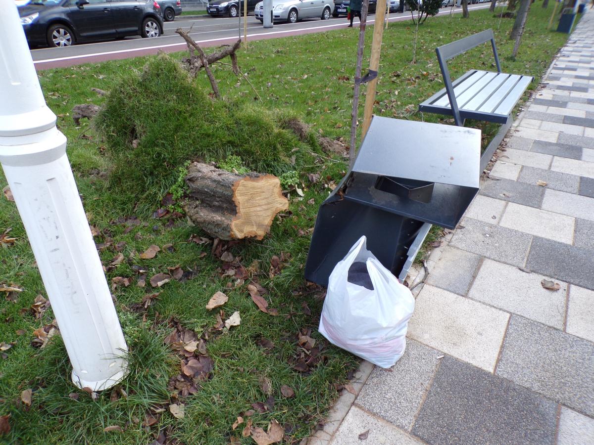 • recipientul aflat pe recent renovatul bulevard Independenței a fost afectat de un copac doborât de o furtună de... astă iarnă • nici până la ora actuală nu a fost reparat sau înlocuit!