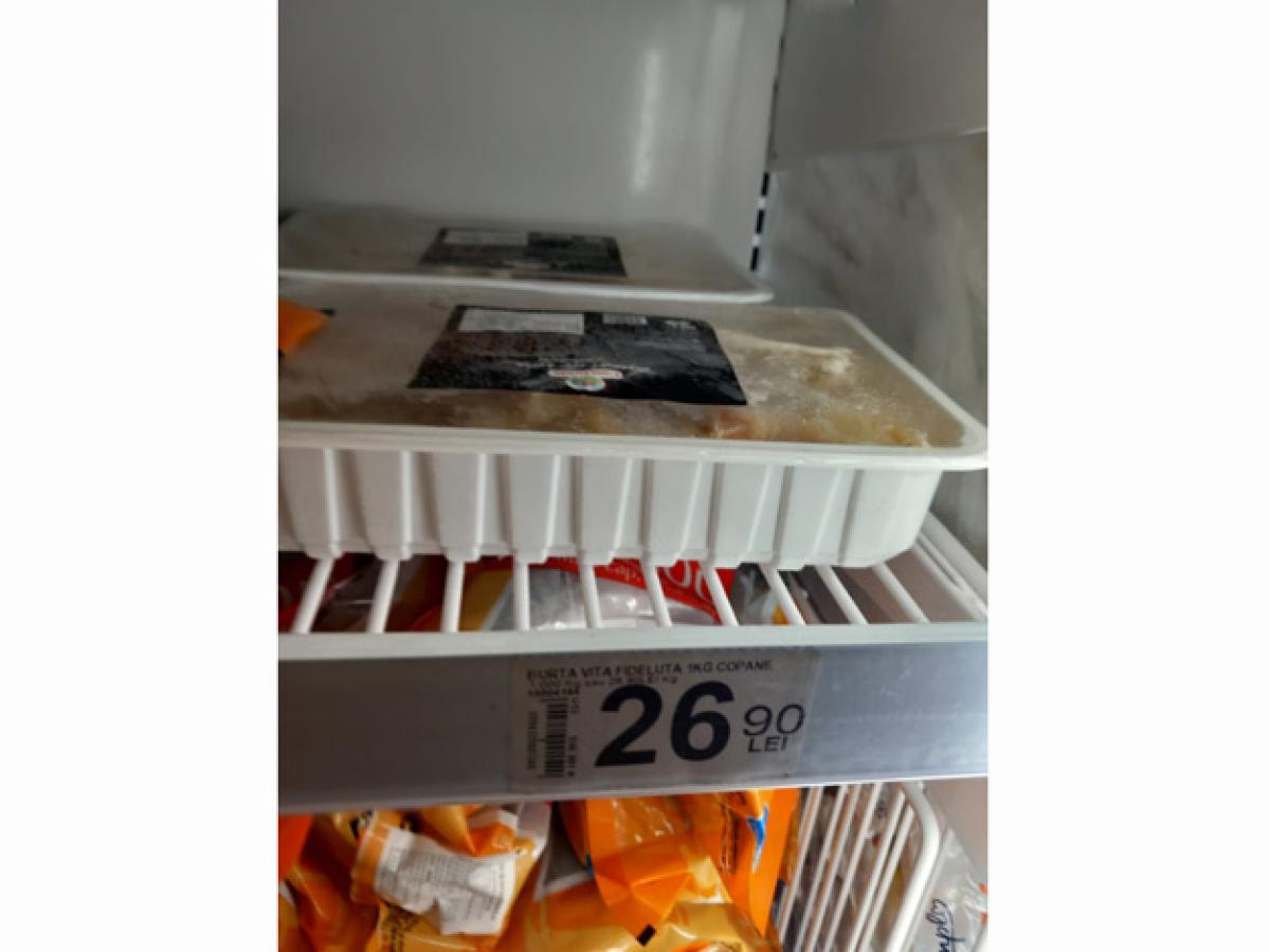 - comercializarea produselor alimentare pentru care nu se respectă temperatura de păstrare stabilită de producător; astfel, acestea prezentau caracteristici calitative neconforme (diverse sortimente de înghețată, ficat de pui, somon, burtă de vită fideluță) cu acumulări de gheață sub ambalaj;