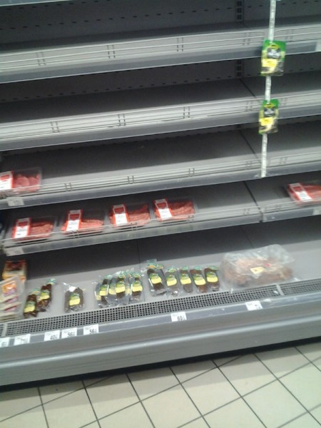 Trei zile de iad alb şi deja rafturile magazinelor din oraş sunt goale. Luni seară, un raid în principalele supermarket-uri din municipiu relevă o altă faţetă a efectelor generate de blocajul instituit pe drumurile naţionale şi din judeţ. Aflate în imposibilitatea de a se aproviziona aşa cum o făceau de obicei, magazinele au rămas fără o bună parte din alimentele de bază gen carne, lactate, dar şi legume şi fructe. Portocalele şi bananele lipsesc la fel ca şi morcovii, cartofii, roşiile, ouăle sau carnea, fie că este vorba de cea de porc, vită sau pui. Din fericire, încă se mai găsesc în galantare ulei, făină, mălai, precum şi apă plată sau minerală, la fel ca şi hârtia igienică sau articolele de igienă. Dar stocurile sunt la limită şi dacă nu se reia cât mai repede circulaţia pe arterele rutiere care leagă municipiul de celelalte judeţe şi nu ajung TIR-urile la punctele de recepţie marfă, vor fi probleme într-o zi, maxim două. "Sperăm ca mâine să ajungă la noi camionul care face alimentarea cu produsele din sectorul fresh, food dar şi non-food. Asta dacă se reia circulaţia pe drumurile naţionale", a explicat personalul din supermarket.