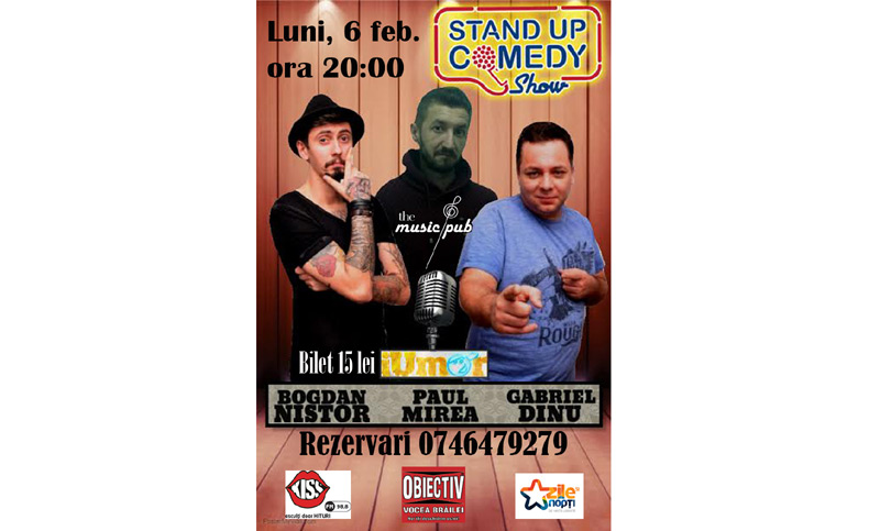 Comedianţii Gabriel Dinu, Paul Mirea şi Bogdan Nistor vor susţine un show Stand Up Comedy, luni seară, la The Music Pub. Aceştia au devenit cunoscuţi la în rândul amatorilor de spectacole de gen după participarea la emisiunea iUmor. Spectacolul de la Brăila este programat la ora 20:00.