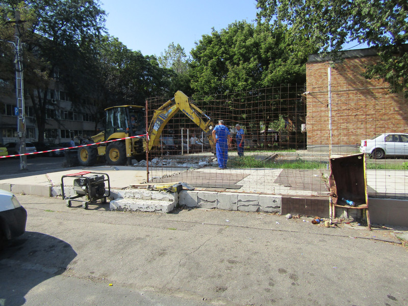 În sfârșit, a intrat în demolare platforma betonată și acoperită cu flise și gresie, aflată în intersecția străzilor Mihai Bravu și Ghioceilor - vizavi de Piața Concordiei și la câțiva metri de sediul Direcției Generale de Asistență Socială și Protecția Copilului (DGSAPC) Braila și Creșa nr. 2. Acolo au funcționat, până acum câțiva ani, tot felul de magazinașe și chioșcuri, construite în fel și chip. De când acestea și-au încetat activitatea, aspectul a fost unul dezolant, cu o conductă de apă curgând, o plasă metalică distorsionată și protecția metalică pentru un contoar de gaze făcută praf! Din câte am aflat, pe surse, terenul este al Consiliului Județean, iar firma Uniel acționează începând de ieri la decopertarea amintită. Tot pe surse ni s-a spus că, fiind în curtea DGSAPC, această instituție urmează să decidă ce anume se va amenaja acolo. Se pare că unităților comerciale care au activat pe amintitul perimetru, le-a expirat contractual, iar zona odată liberă de orice sarcină ar urma să fie folosită adecvat de către DGASPC. Deocamdată, nu ni s-a dat nicio informație oficială cu viitoarea utilitate. Cert este că, în primă instanță, locul va fi împrejmuit.