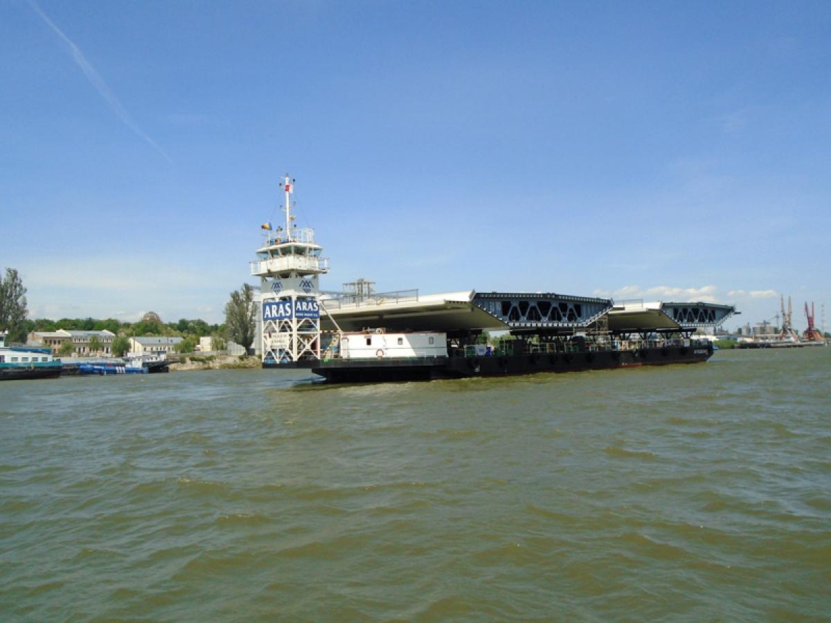 Nici nu s-a depărtat bine vaporașul de mal, că a și fost ajuns din urmă de uriașa barjă "Aras" care transporta doi tablieri, de câte 30 de metri lățime, piese metalice confecționate special pentru Pod având, fiecare, 250 de tone. Până pe 12 mai, fuseseră montate pe poziție 28 de astfel de tablieri realizați la Șantierul Naval "Vard" Brăila.