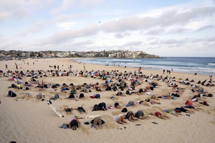 Pe plaja Bondi din Sydney, aproximativ 400 de bărbaţi, femei şi copii au săpat gropi în nisip şi şi-au îngropat capetele în ele, protestând faţă de refuzul lui Tony Abbott de a discuta şi analiza chestiuni urgente şi importante.