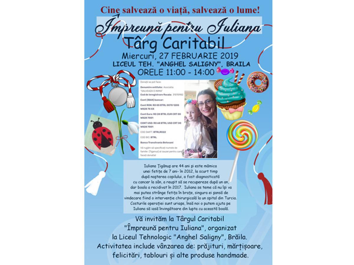 “Cine salvează o viaţă, salvează o lume!”. Sub acest slogan se va desfăşura, pe 27 februarie, Târgul caritabil “Împreună pentru Iuliana”, organizat de Liceul Tehnologic “Anghel Saligny”, unitatea de învăţământ unde Iuliana Ţigănuş este profesoară de geografie. Activitatea va avea loc între orele 11.00-14.00, timp în care vizitatorii pot cumpăra diverse obiecte oferite spre vânzare, cum ar fi mărţişoare, felicitări, tablouri sau prăjituri.
