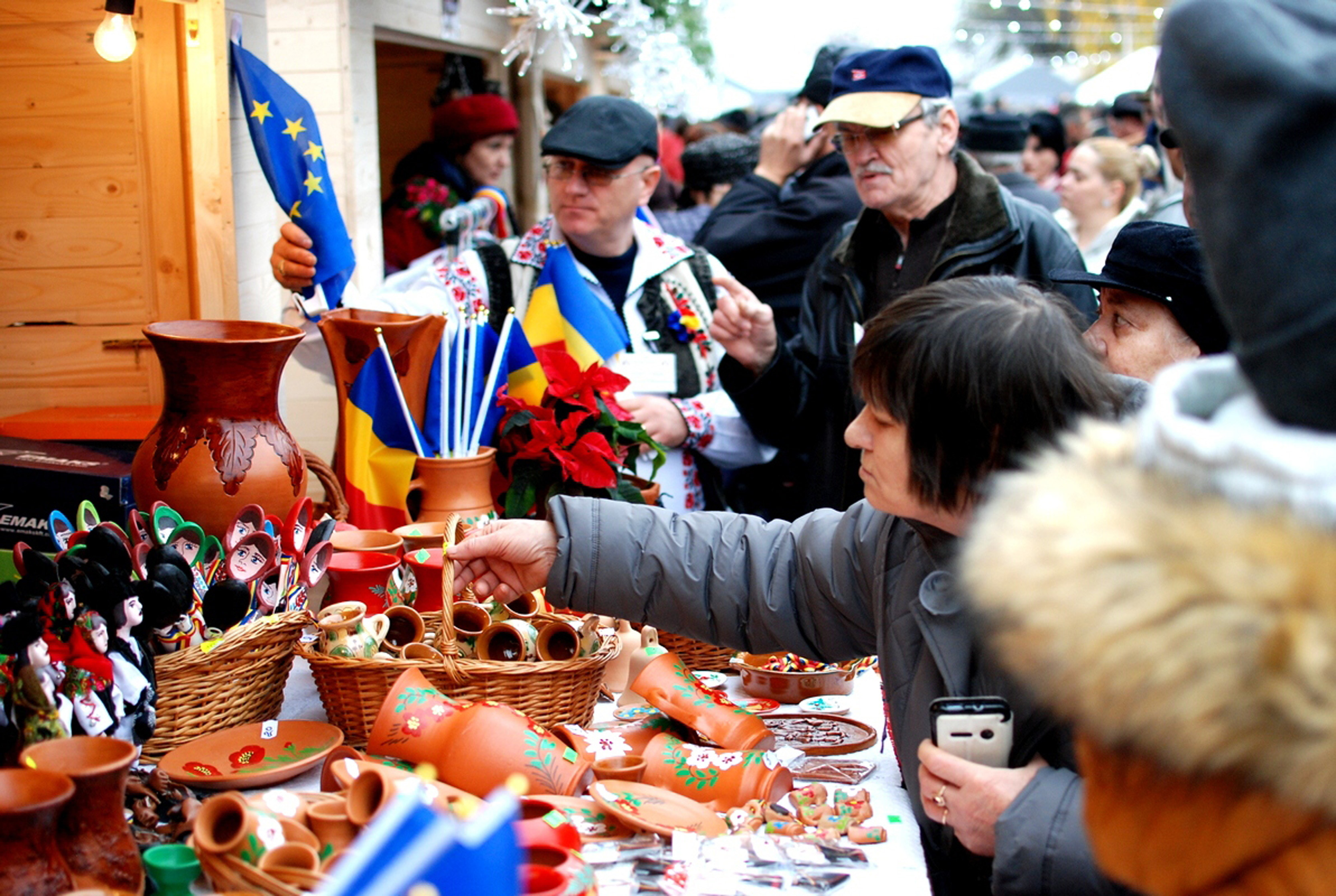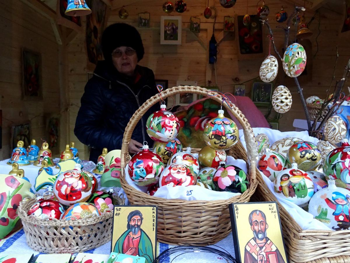 La o tarabă învecinată, meşterul popular Lăcrămioara Mihoreanu din Botoşani a expus globuri de sticlă pictate manual, icoane din lemn sau poşete realizate din pâslă. Globurile pentru brad, care sunt incomparabil mai frumoase decât cele chinezeşti, din plastic, costă 25 sau 35 de lei, însă brăilenii nu prea s-au înghesuit să le cumpere. Lăcrămioara Mihoreanu ne-a spus că alte obiecte manufacturate de ea au avut, totuşi, căutare la public şi că, per total, este mulţumită de felul cum au decurs lucrurile. “Eu fac toate acestea mai mult ca hobby, mai puţin mă interesează partea financiară. La Brăila e prima dată când am venit dar m-am simţit foarte bine, iar dacă o să mai fiu invitată o să vin din nou, cu mare plăcere”, ne-a spus botoşeneanca.