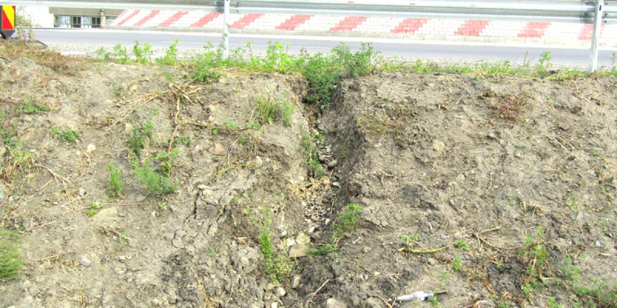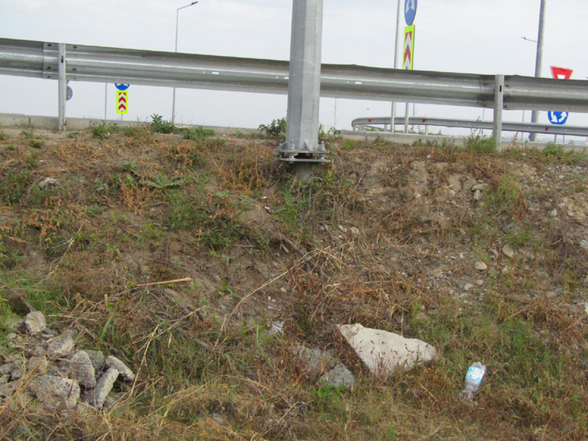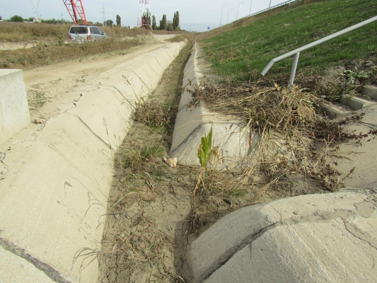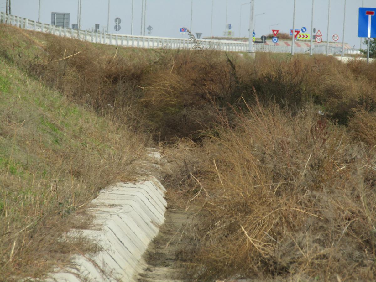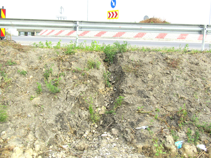 În timpul execuției taluzului, era plăcut privirii când, acesta, cu maiuri mecanice, cu excavatorul şi manual era executat în două trepte, la 45 de grade, lăsând impresia că va fi indestructibil. Numai că, în timp, şi mai ales după nesfârşitele ploi din acest an, taluzul arată îngrijorător: cu foarte multe scurgeri de pământ care au colmatat canalele de preluare a apelor pluviale. Sunt locuri unde au apărut şi adevărate crevase, găuri la baza carosabilului şi a stâlpilor electrici! Doar ici-colo se mai poate vedea un taluz verde, neafectat de ploi. Cât priveşte canalele din beton, în unele zone sunt în contrapantă şi colmatate, sau, pe sute de metri, pline cu bălării. De altfel, toată zona din apropiere de pod, unde a fost organizarea de şantier, este pe hectare întregi ocupată de bălării şi vegetaţie uscată etc. Cine deţine oare aceste terenuri ?!