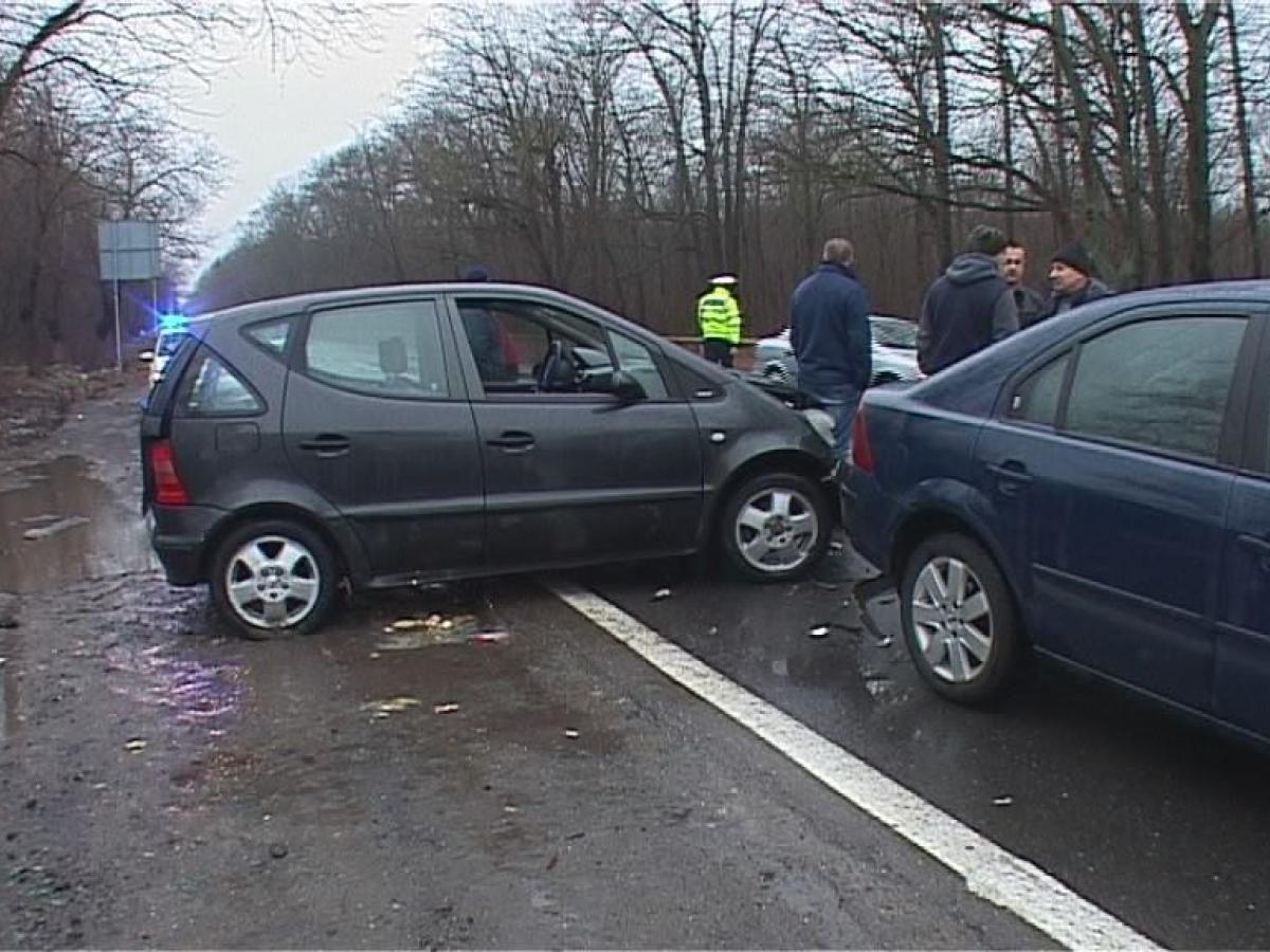 În timp ce stăteau în colană, trei şoferi s-au trezit cu maşinile lovite de un al patrulea, care, din neatenţie sau pur şi simplu din grabă, a intrat în depăşire. În momentul în care din sens opus s-a trezit cu un alt vehicul, a tras de volan dreapta, a derapat, s-a răsucit în şosea şi a lovit cele trei autoturisme. Cel mai şifonat a ieşit un Mercedes.