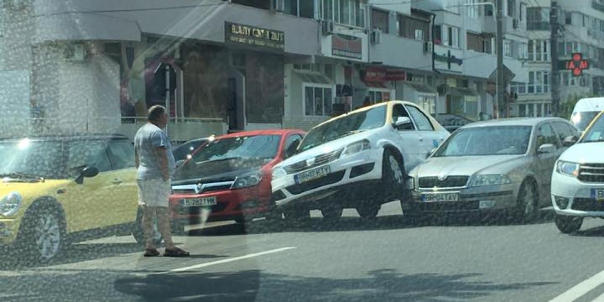 * un taxi s-a „urcat” pur și simplu pe două mașini, râmânând suspendat * din fericire, nu au fost victime * internauții au dat frâu liber imaginației și spun că șoferul care a reușit „cascadoria” ar trebui să joace în filme
