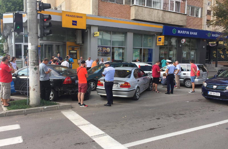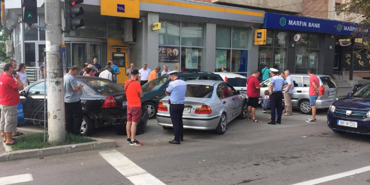 În urma cercetărilor efectuate la faţa locului, poliţiştii au stabilit că, în ziua de 30 iulie, în jurul orei 17.00, o şoferiţă din Prahova, de 30 de ani, aflată la volanul unui autoturism, circula pe Calea Călăraşilor, pe banda a doua de mers. În acelaşi sens, dar pe banda a treia, circula maşina condusă de un brăilean de 39 de ani. La intersecţia cu strada Griviţa, conducătoarea auto a vrut să vireze stânga. Ea nu s-a asigurat la schimbarea direcţiei, intrând în coliziune cu maşina condusă de şoferul brăilean. După impactul violent, au mai fost acroşate alte 4 autoturisme parcate. Fiind doar pagube materiale, evenimentul a fost înregistrat ca tamponare. Poliţiştii au studiat camerele de supraveghere, în acest fel reuşind să stabilească şoferul vinovat de producerea incidentului rutier.